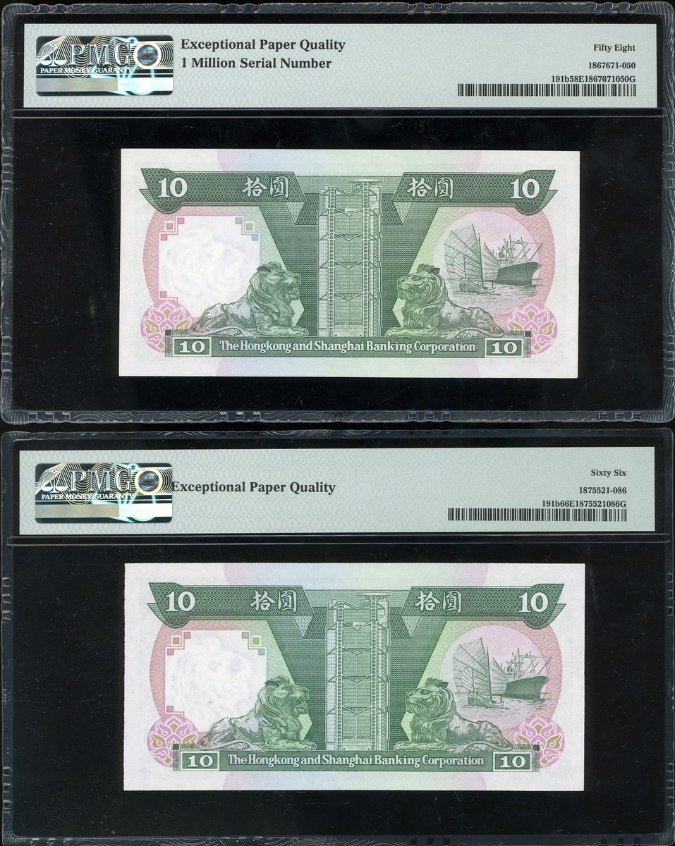 1988年香港上海匯豐銀行$10幸運號一對,編號VR000001 及 VR1000000,分別PMG 58EPQ 及 66EPQ