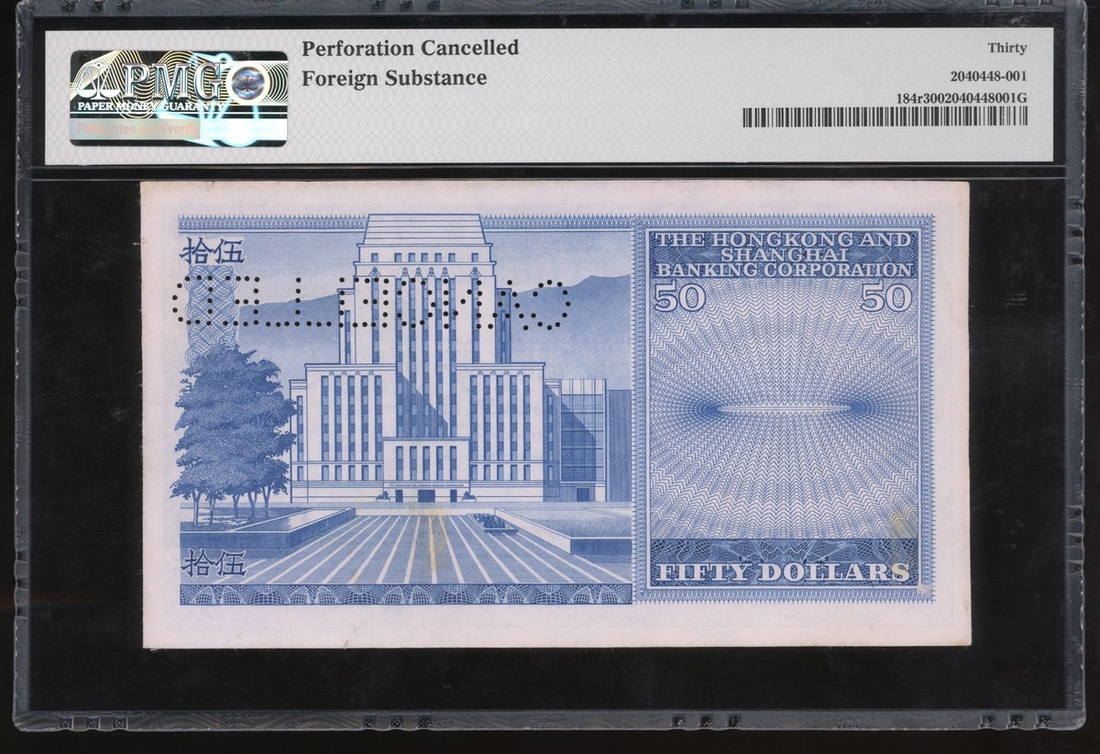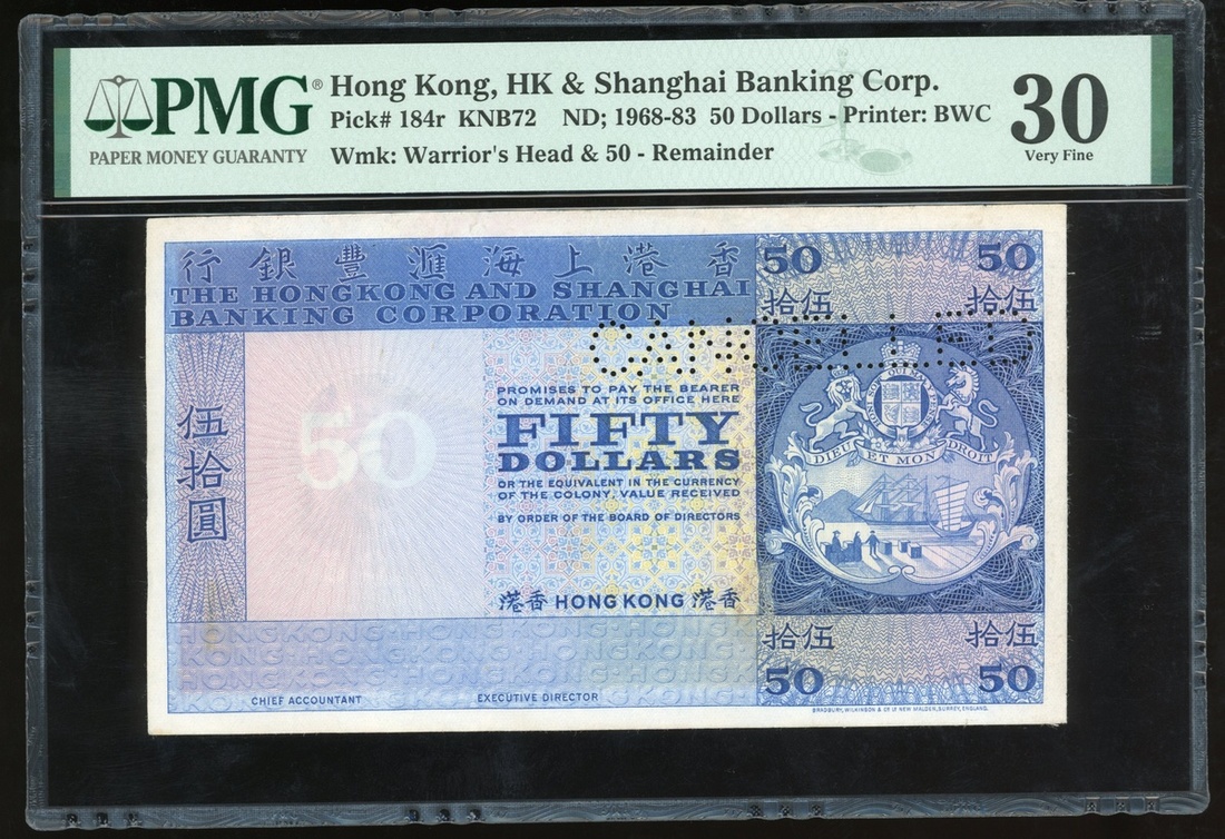 1968-83年香港上海匯豐銀行$50庫存票,無編號,日期及簽署,打孔注銷,PMG 30 有外附物