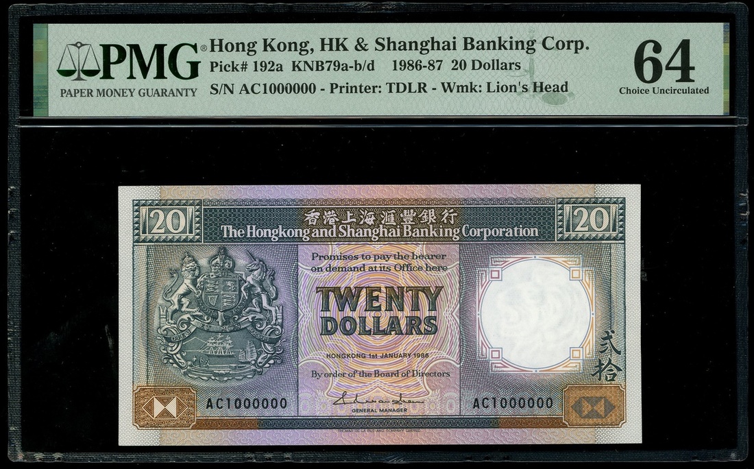 The Hongkong and Shanghai Banking Corporation, $20, 1.1.1986, lucky serial number AC1000000, (Pick 192a), PMG 64 Choice Uncirculated and rare to find a 1 million number serial for this series
