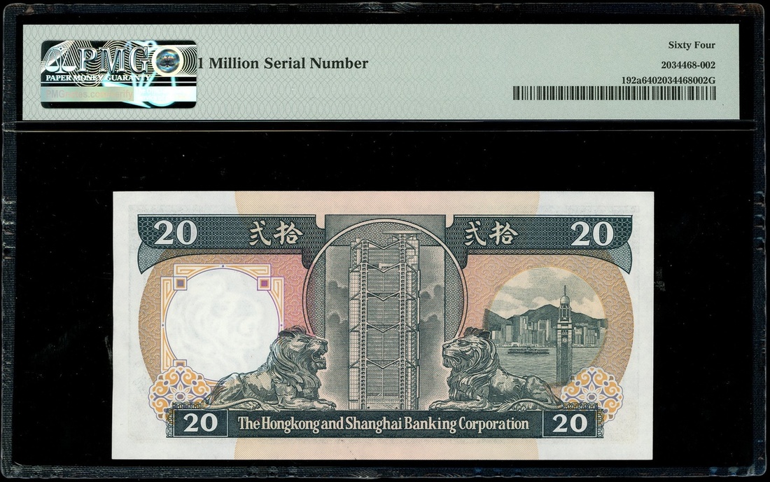 1986年香港上海匯豐銀行$20,幸運號AC1000000,PMG 64,此系列少見之一百萬號票