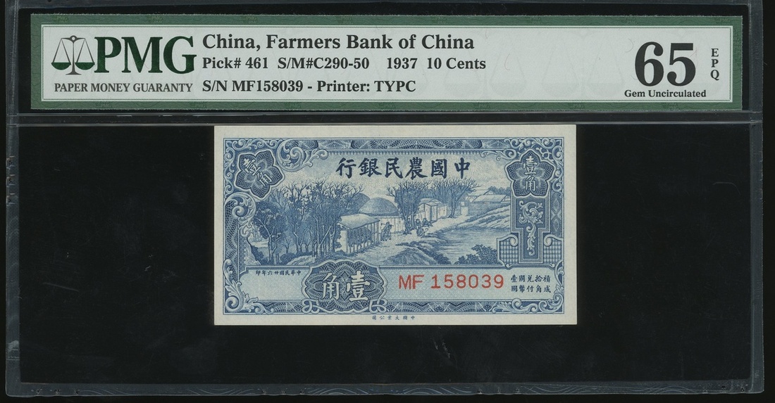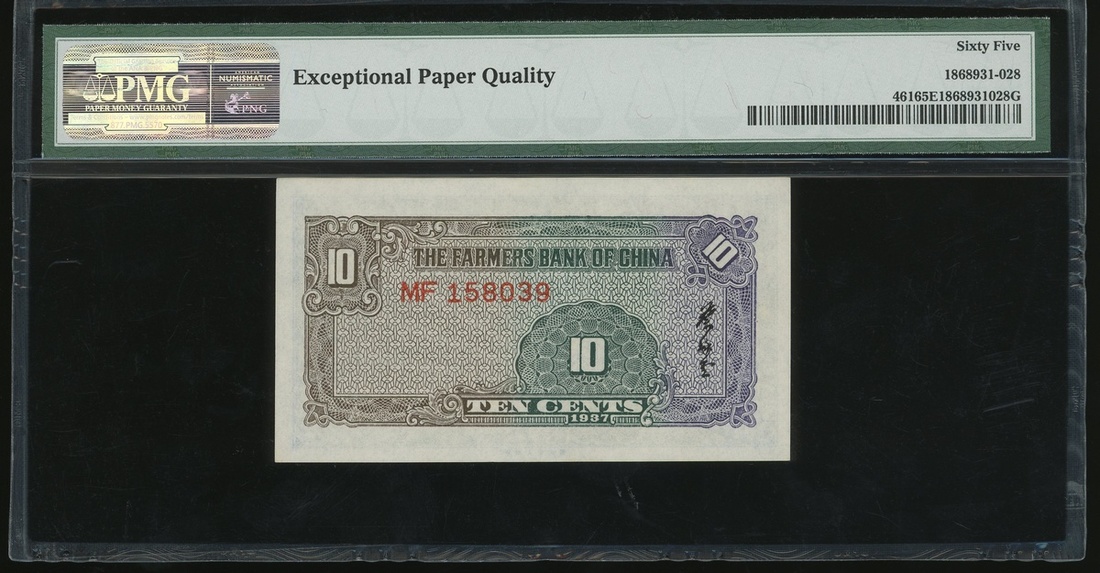 1937年中國農民銀行1角,編號MF158039,PMG 65EPQ
