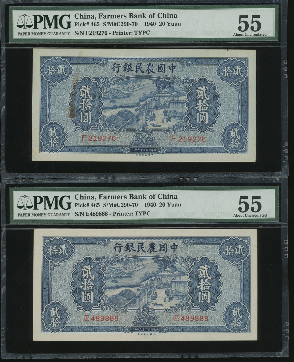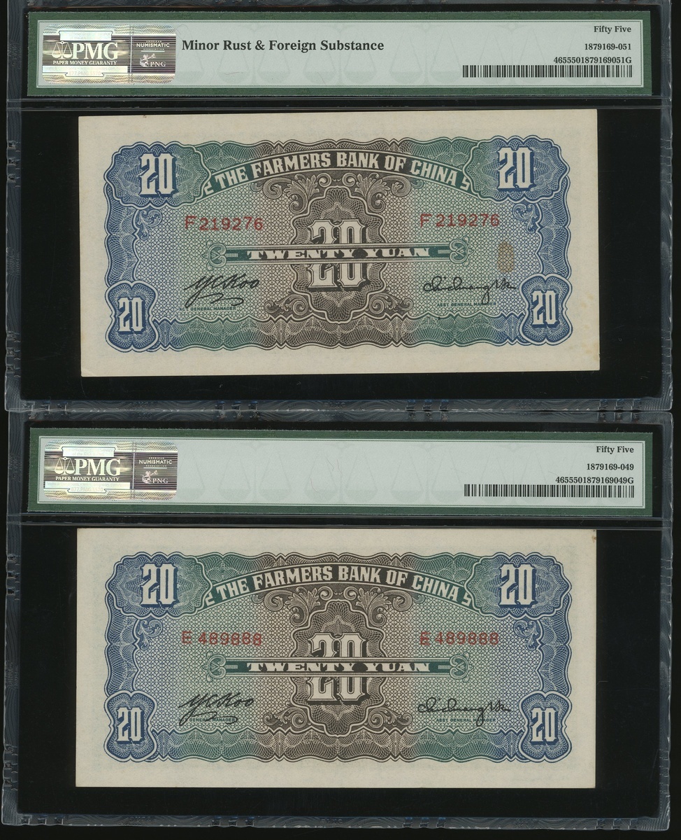 1940年中國農民銀行20元一組2枚,大業版,編號E489888及F219276,均PMG 55,後者有外附物(2)