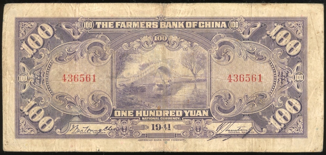 The Farmers Bank of China, 100 yuan, Chungking, Year 30(1941), no prefix serial number 436561, (Pick 477b), very fine.
