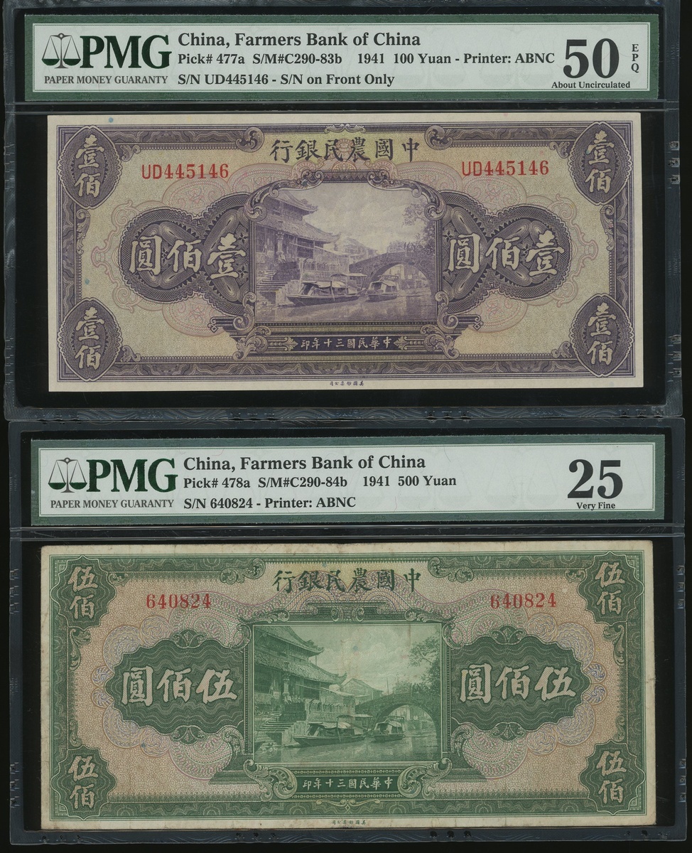 Farmers Bank of China, a pair of 100 and 500 yuan, Year 30 (1941), serial numbers UD445146 and 640824, printed by ABNC,