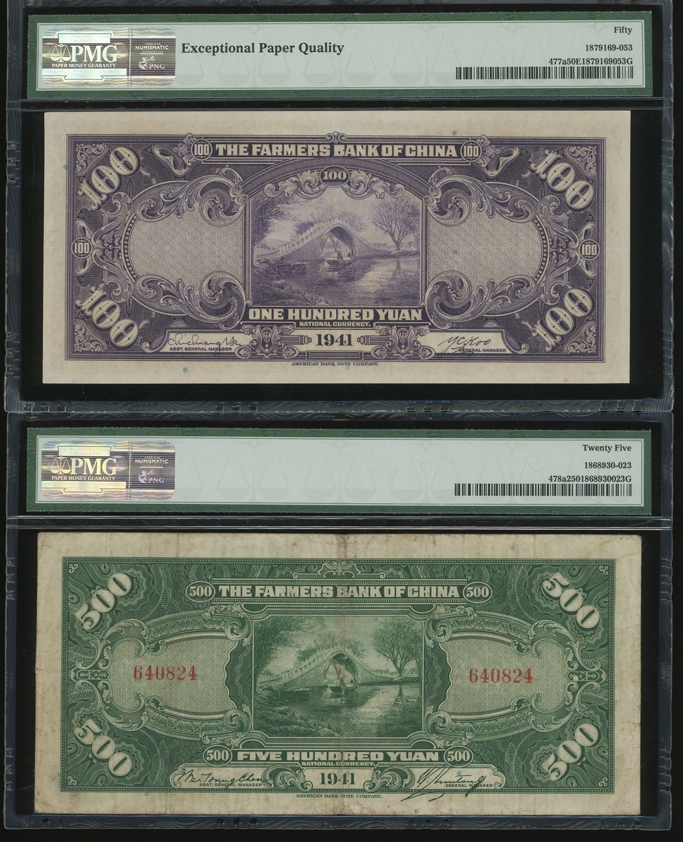 1941年中國農民銀行100元、500元一組2枚,編號UD445146及631542,分別PMG 25及30(2)
