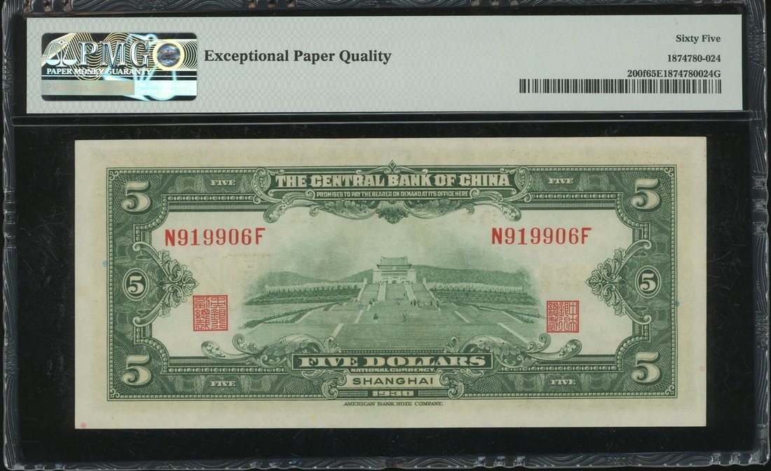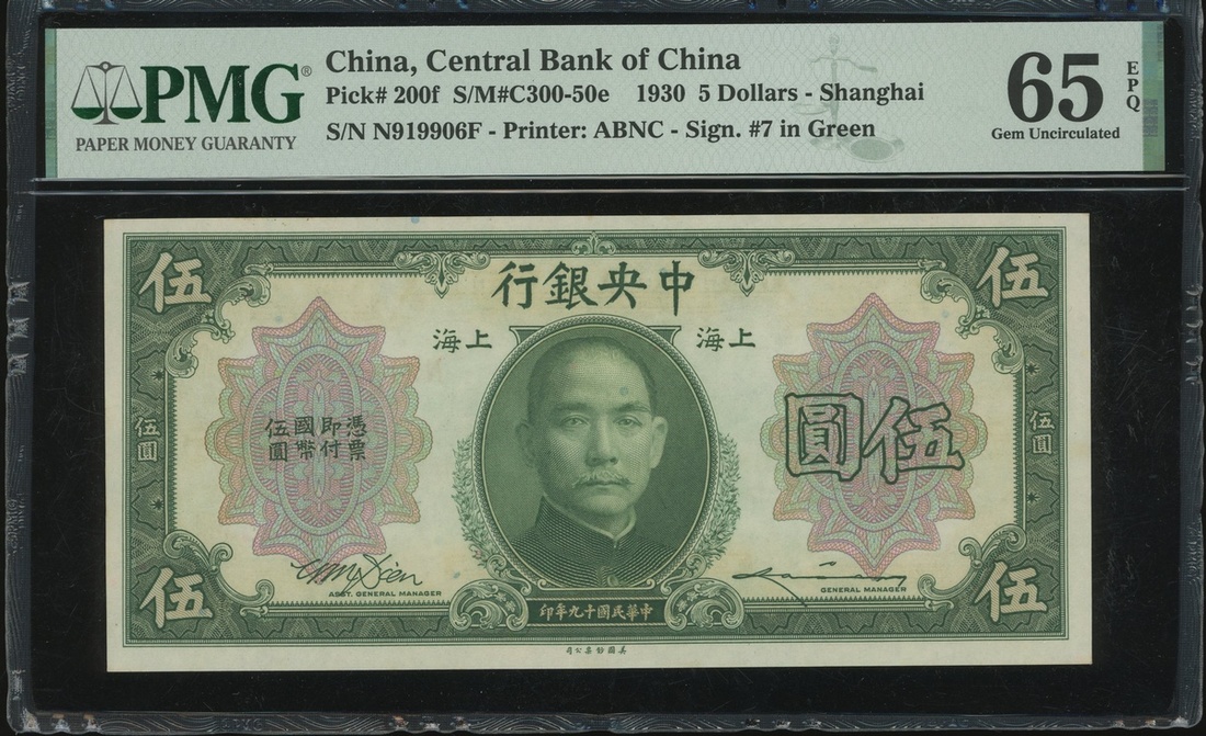 Central Bank of china, $5, Shanghai, Year 19(1930), serial number S919906F, (Pick 200f), PMG 65EPQ Gem Uncirculated.