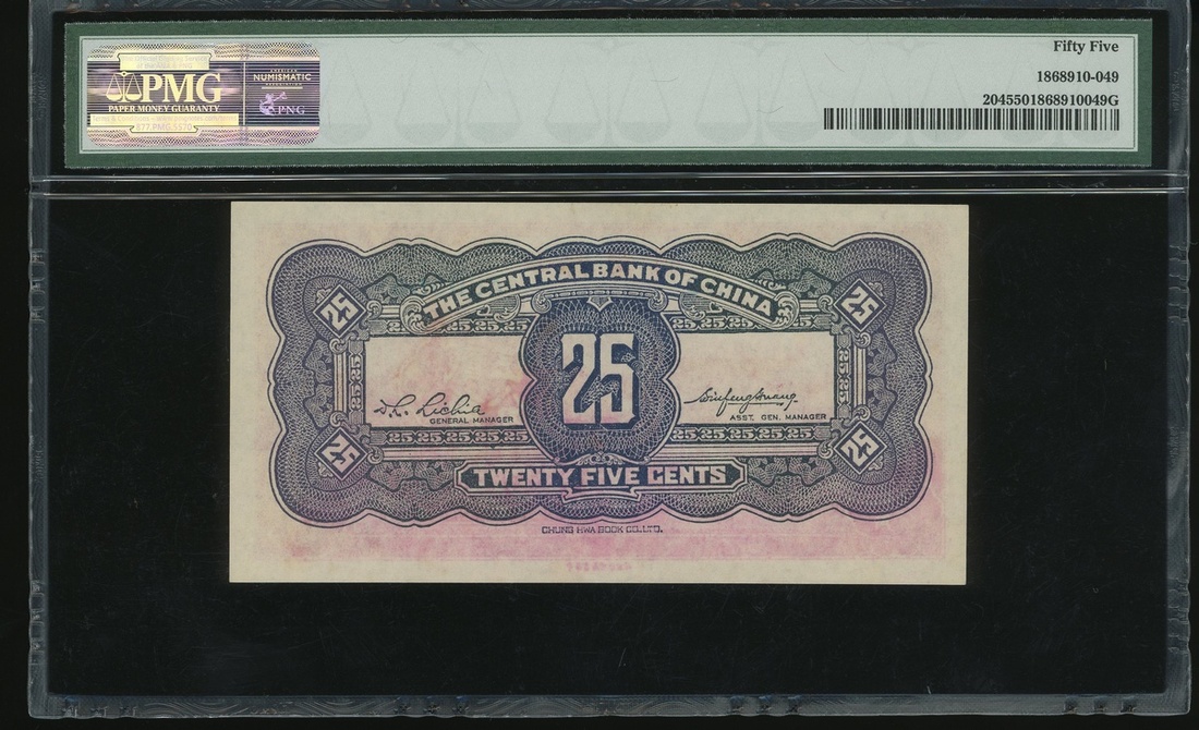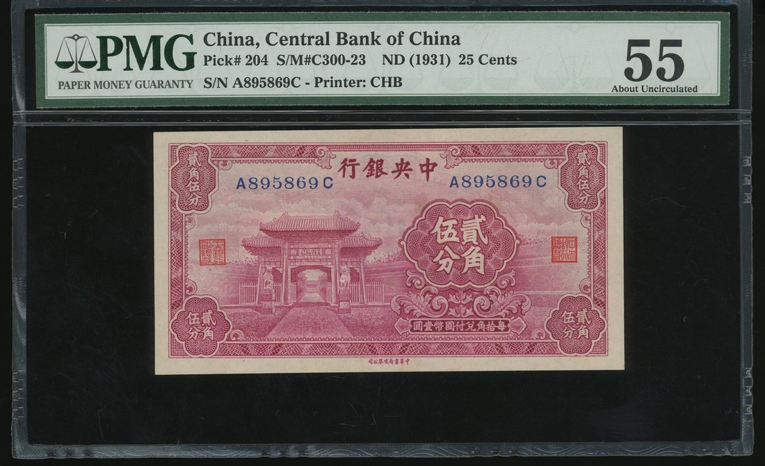 Central Bank of China, 25 cents, ND(1931), serial number A895869C, (Pick 204), PMG 55 About Uncirculated.