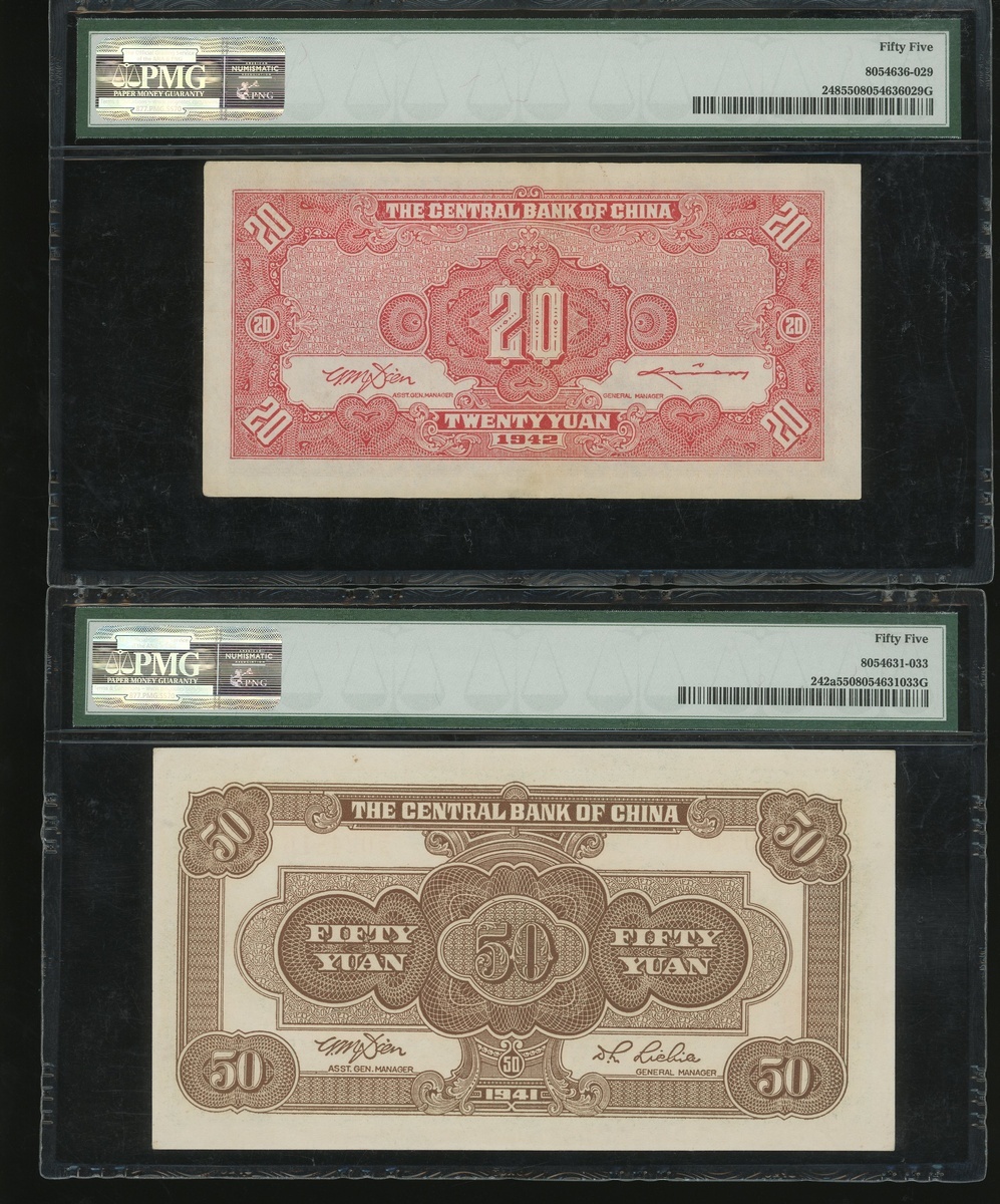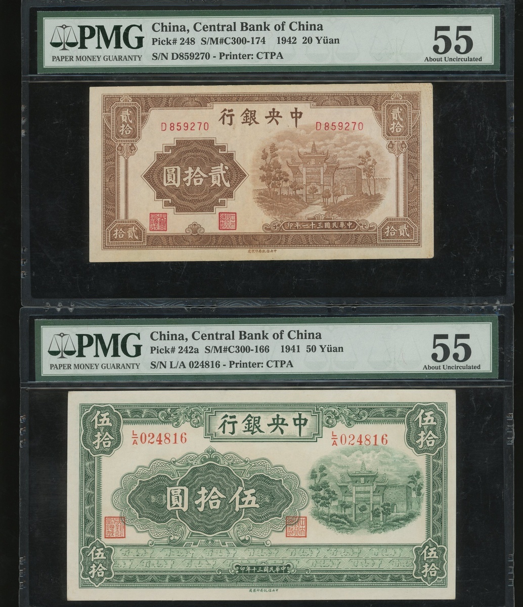 The Central Bank of China, 20 Yuan, 1942, 50 Yuan, 1941 and 500 Yuan, 1945, serial number D859270, L/A 024816 and DN228467, 'Pai-Lou' gate at obverse, (Pick 248, 242a, 305), graded PMG 55, 55 and 58 respectively (3)