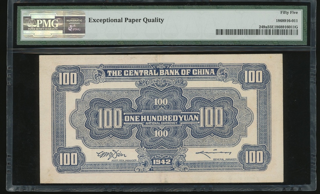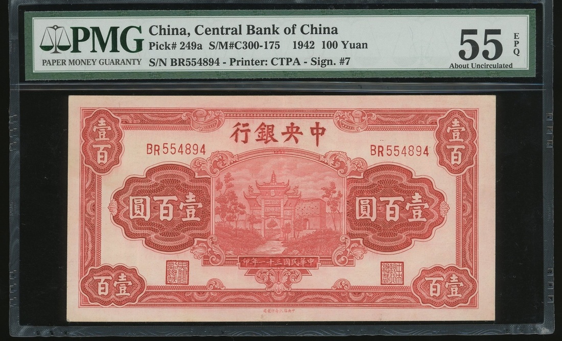 Central Bank of China, 100 yuan, year 31(1942), serial number BR554894, (Pick 249a), PMG 55EPQ About Uncirculated.