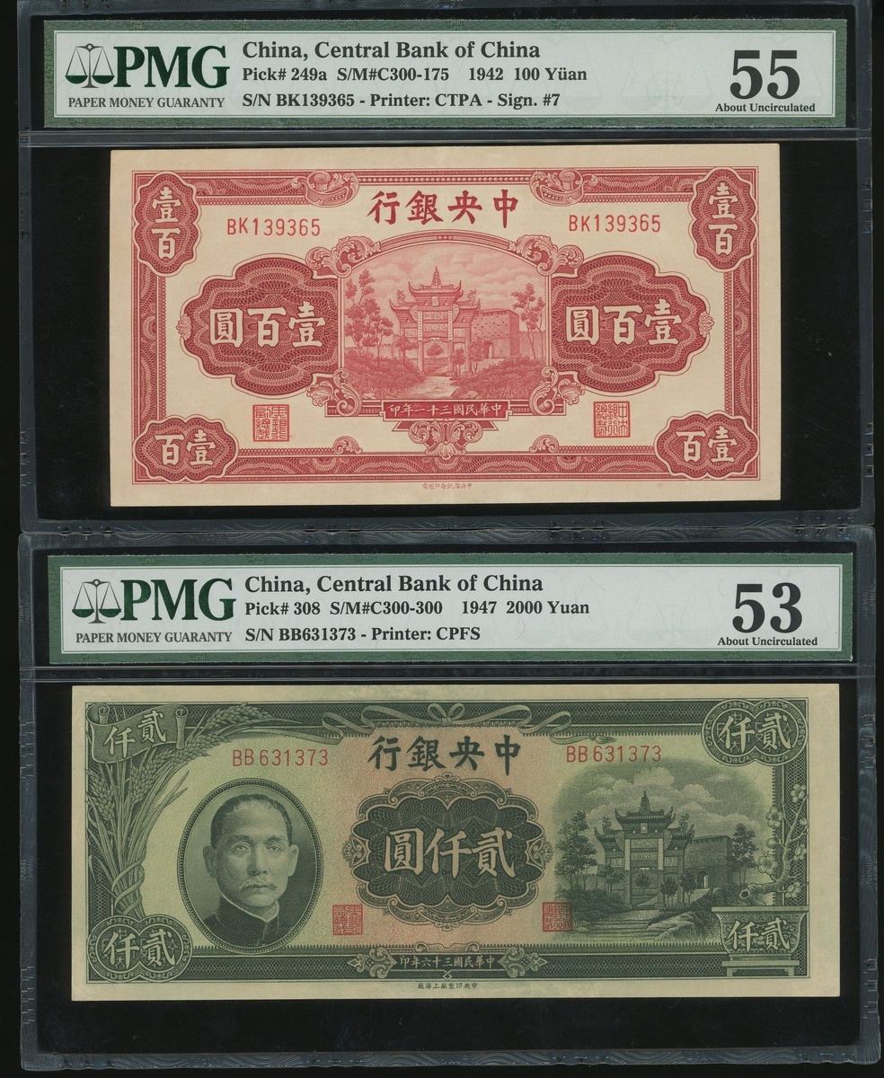 Central Bank of China, a pair of 100 yuan and 2000 yuan, Year 31(1942) and Year 36(1947), serial numbers BK139365 and BB631373, (Pick 249a and 308), PMG 55 and 53 respectively (2).