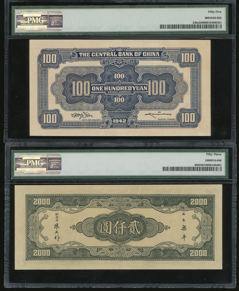 1942年至1947年中央銀行100元、2000元一組2枚,編號BK139365及BB631373,分別PMG 55及53(2)