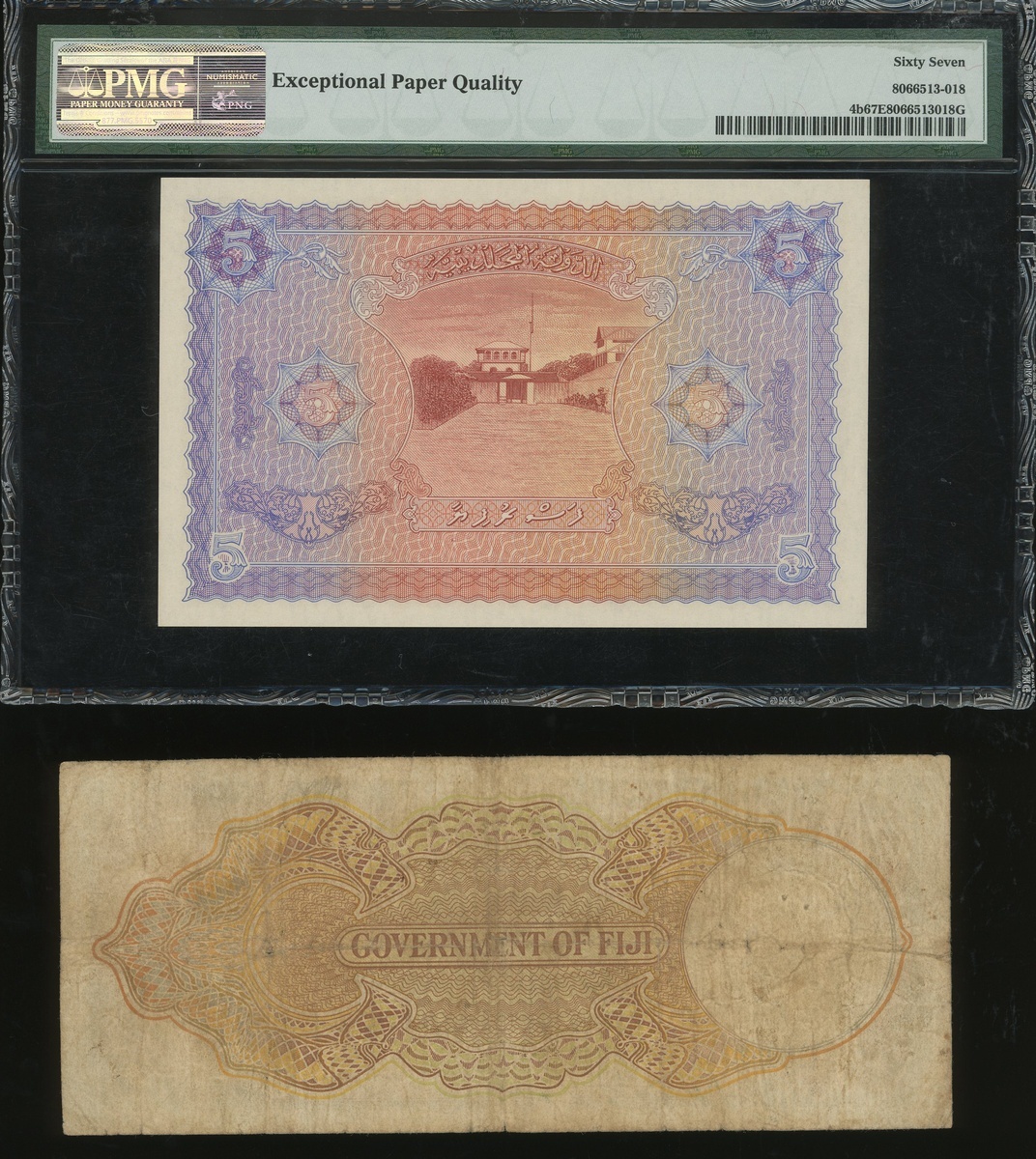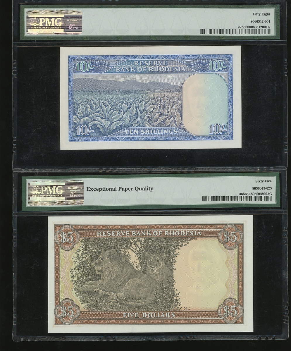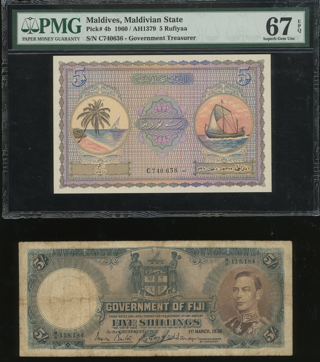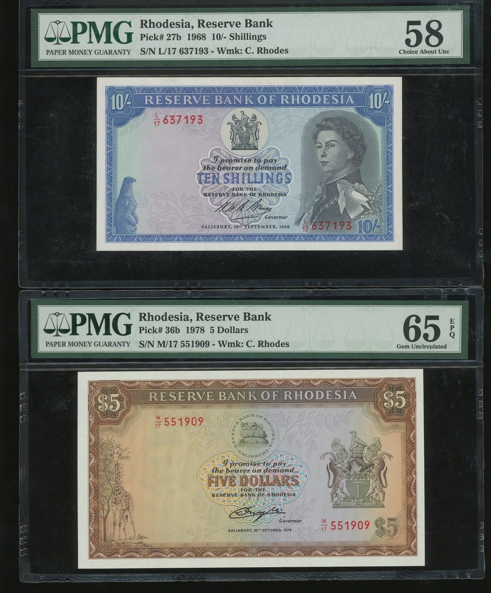 Reserve Bank of Rhodesia, a pair of 10 shillings and $5, 1968 and 1978, also Maldivian State, 5 rufiyaa, 1960 and Government of Fuji, 5 shillings, 1938, (Pick 27b, 36b, 4b and 37b), PMG 58, 65EPQ, 67EPQ and Very Good respectively (4) .