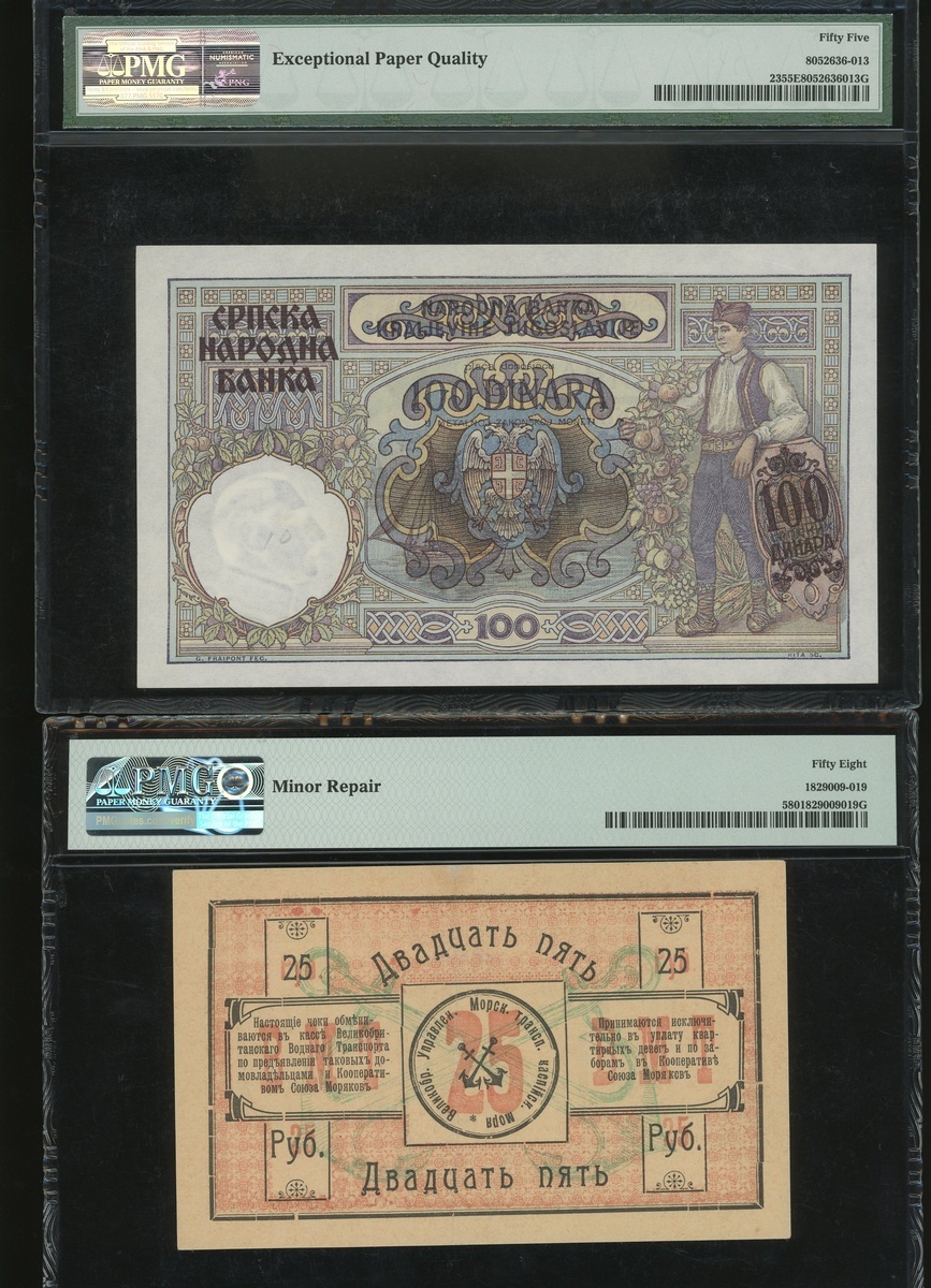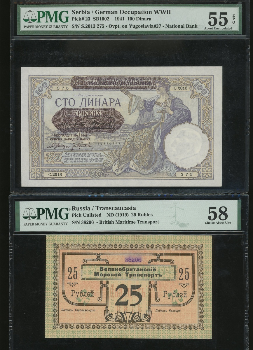 Russia, a pair of 25 rubles, Transcaucasia, ND(1919), and 500 rubles, East Siberia, 1920, and Serbia 100 dinara, 1941, serial numbers 38206, AA00511 and S.20130275, (Pick unlisted, S1207 and 23), graded PMG 58(Minor Repair), 55 and 55EPQ respectively (3) .