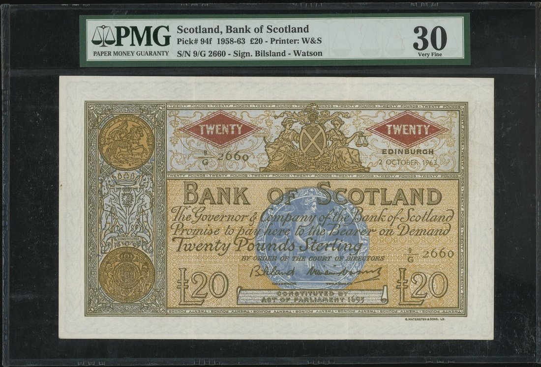 Bank of Scotland, 20 pounds, 2.10.1963, serial number 9/G 2660, (Pick 94f), PMG 30 Very Fine .