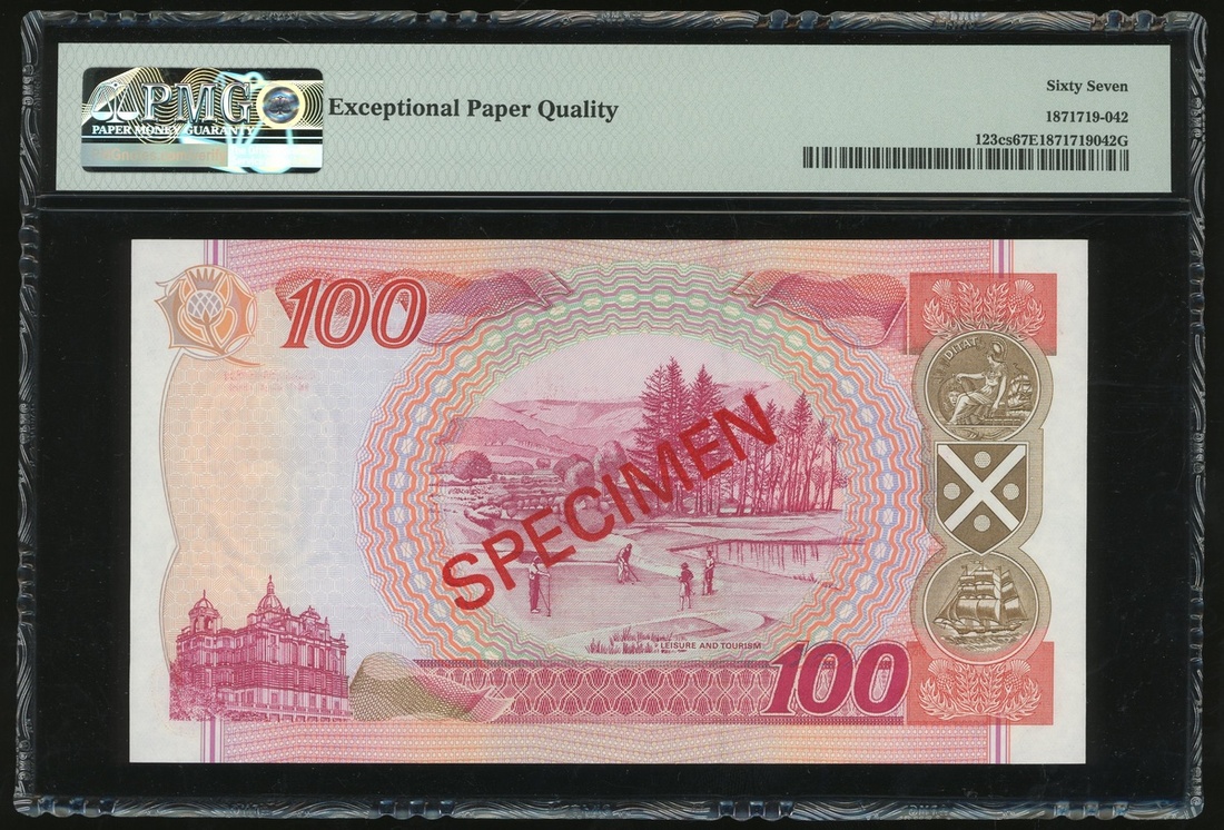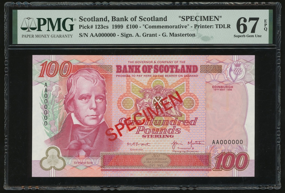 1999年蘇格蘭銀行100鎊樣票,編號AA000000,PMG 67EPQ