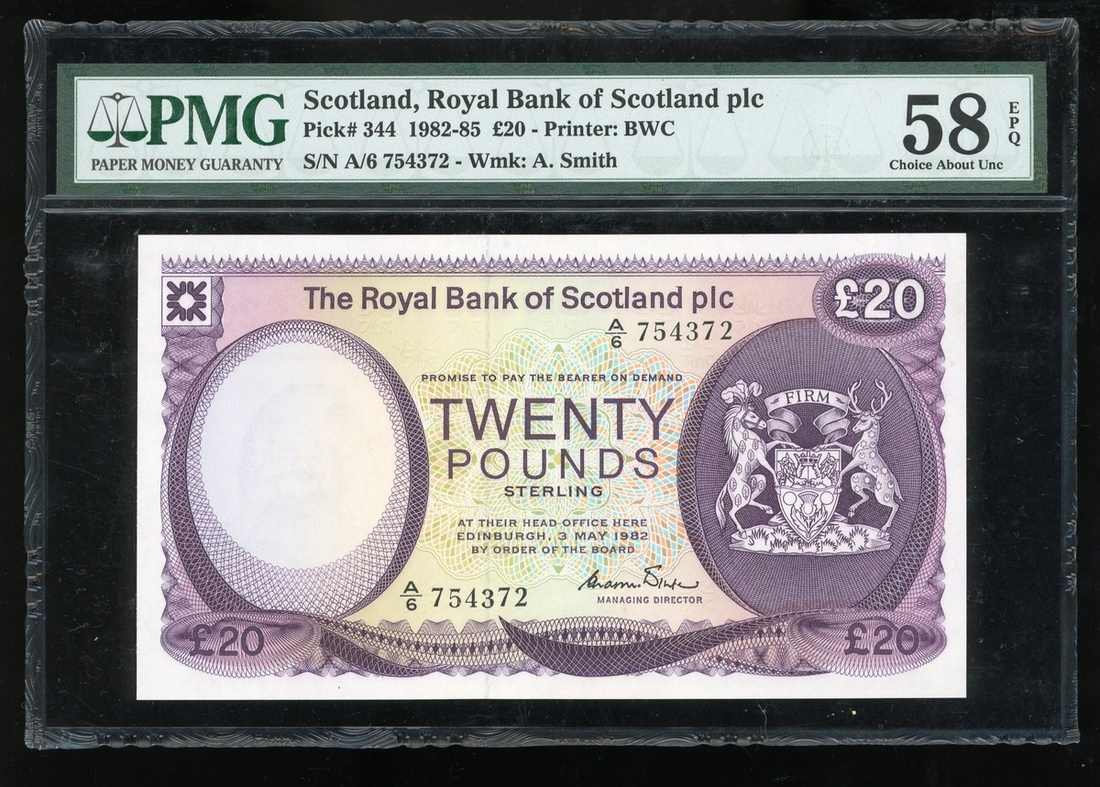 Bank of Scotland, 20 pounds, 3.5.1982, serial number A/6 754382, (Pick 344), PMG 58EPQ Choice About Uncirculated.