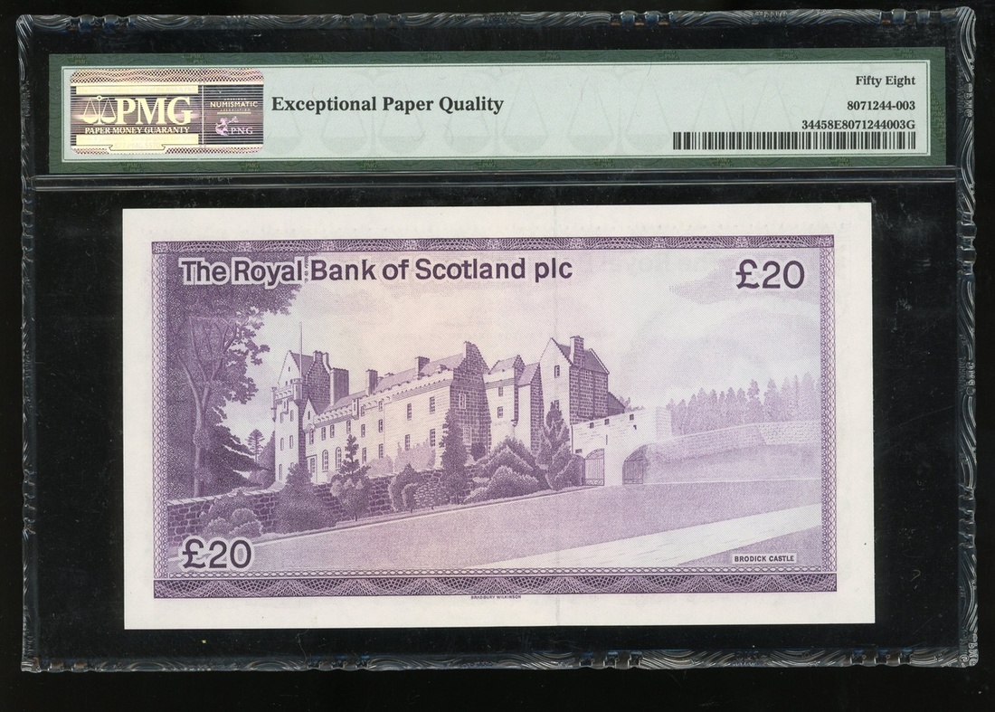 1982年蘇格蘭銀行20鎊,編號 A/6 754382,PMG 58EPQ