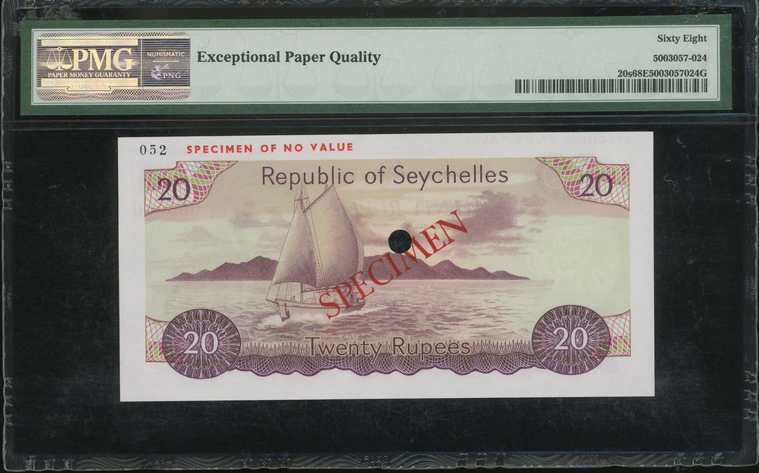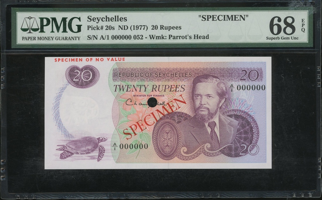 1977年塞席爾20盧比樣票,編號A/1 000000 052,PMG 68EPQ