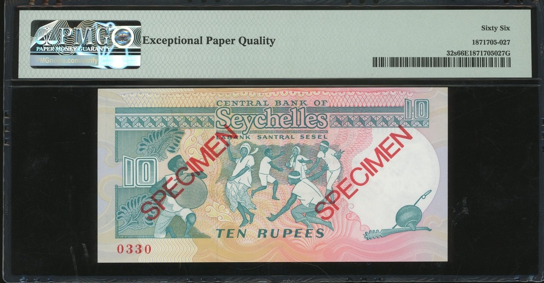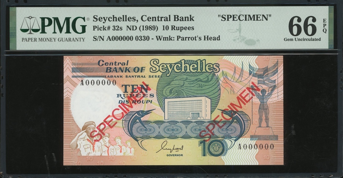 Seychelles: Central Bank, 10 rupees, no date (1989), serial number A000000, (Pick 32s), PMG 66EPQ Gem Uncirculated