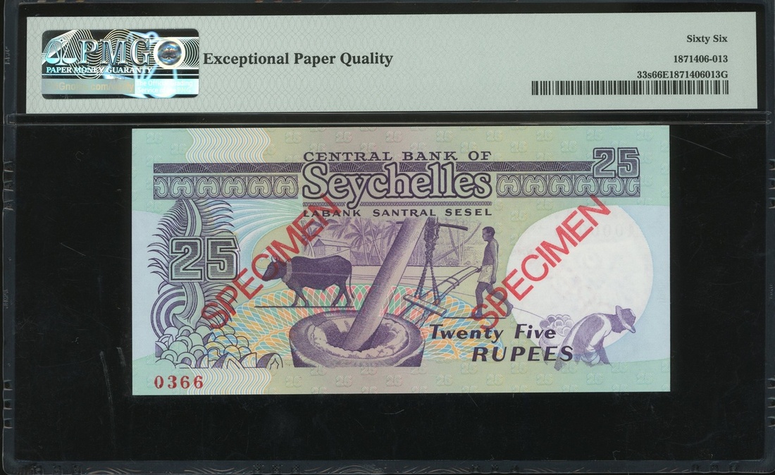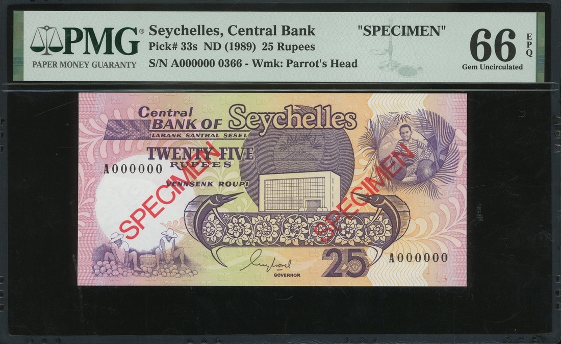 Seychelles: Central Bank, 25 rupees, no date (1989), serial number A000000, (Pick 33s), PMG 66EPQ Gem Uncirculated