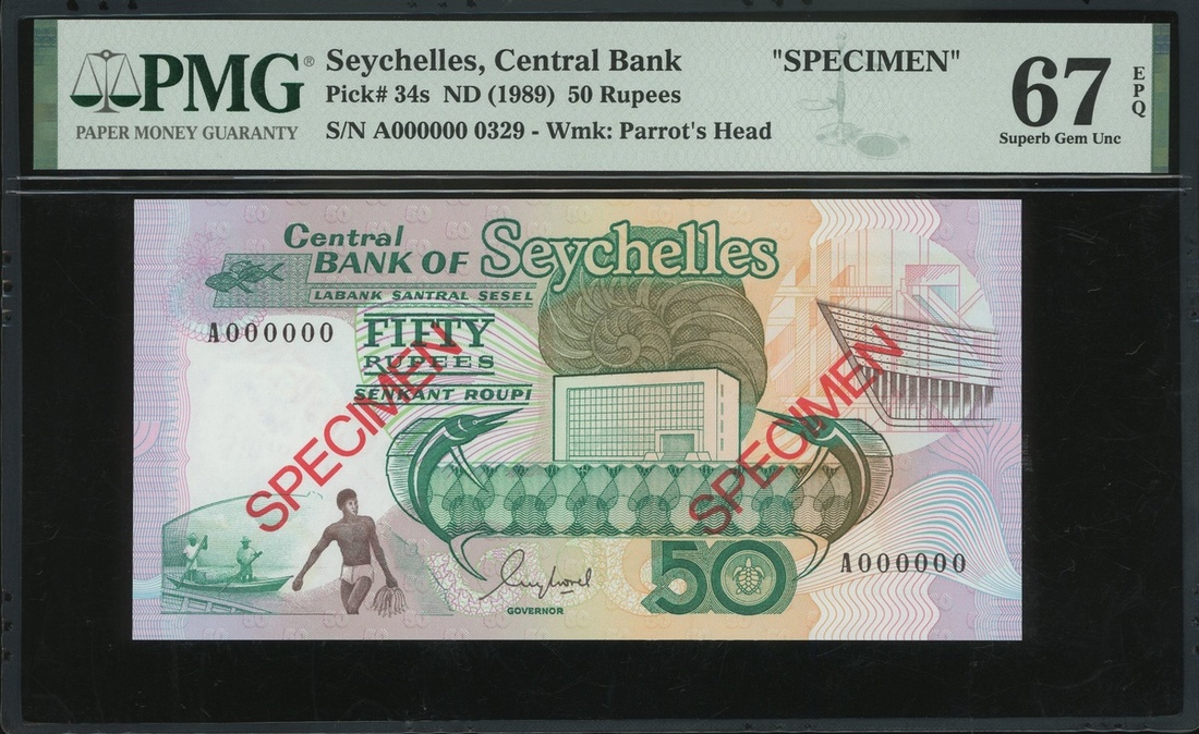 Seychelles: Central Bank, 50 rupees, no date (1989), serial number A000000, (Pick 34s), PMG 67EPQ Superb Gem Uncirculated