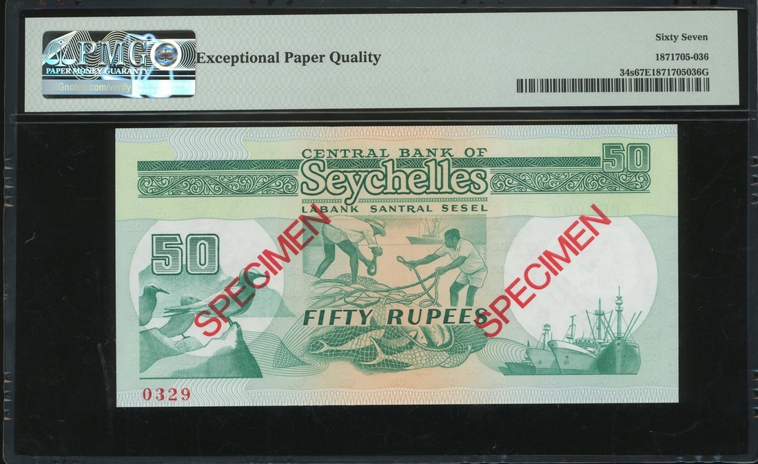 1989年塞席爾50盧比樣票,編號A000000,PMG 67EPQ