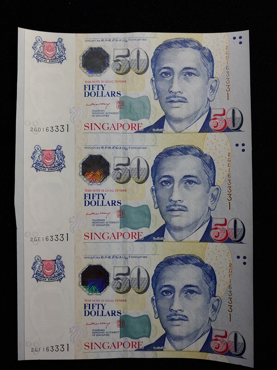 1995年新加坡50元3連體鈔,無日期,編號2GD/GE/GF163331,UNC