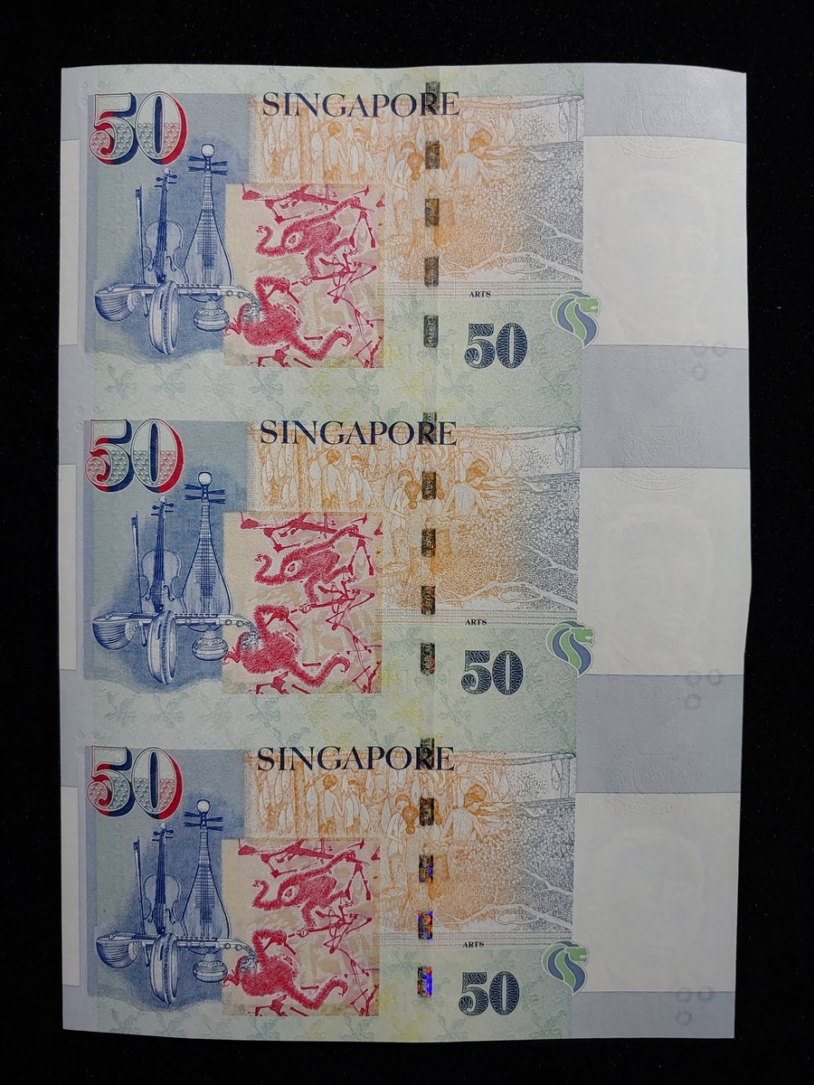 Singapore, an uncut sheet of 3x $50, ND, serial number 2GD/GE/GF163331, blue on multicolour underprint, Yusof bin Ishak at right, arms at top left,