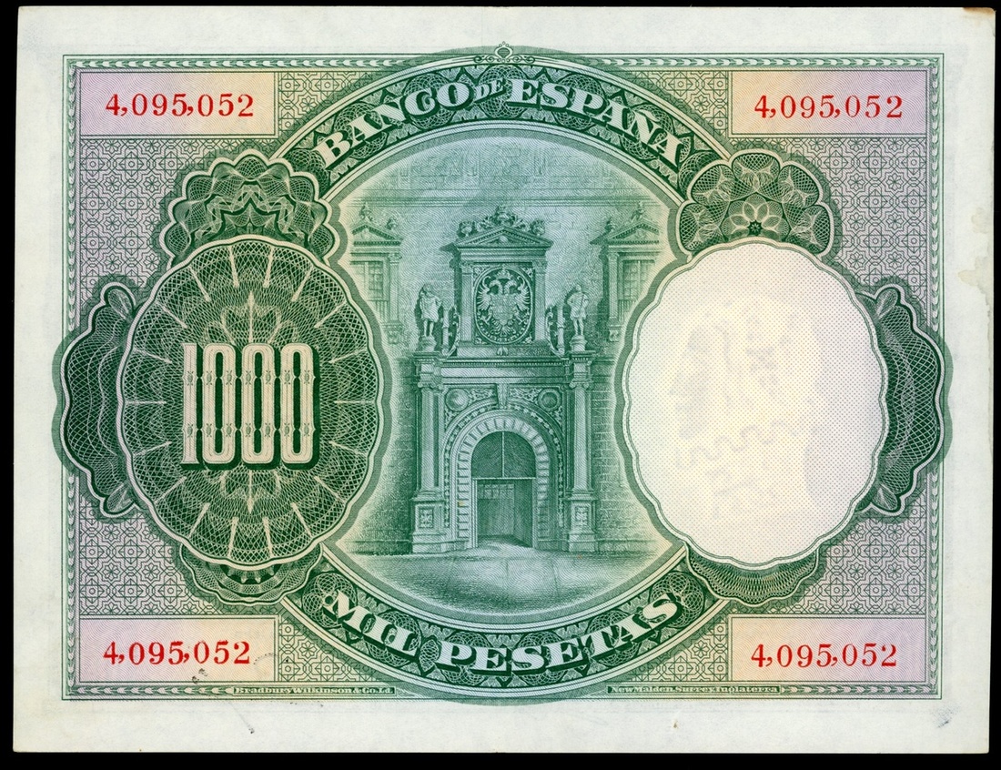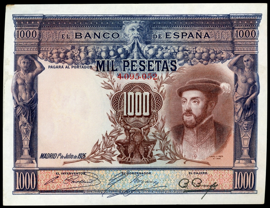 1925年西班牙1000比塞塔,編號49050512,AEF,左側有修補