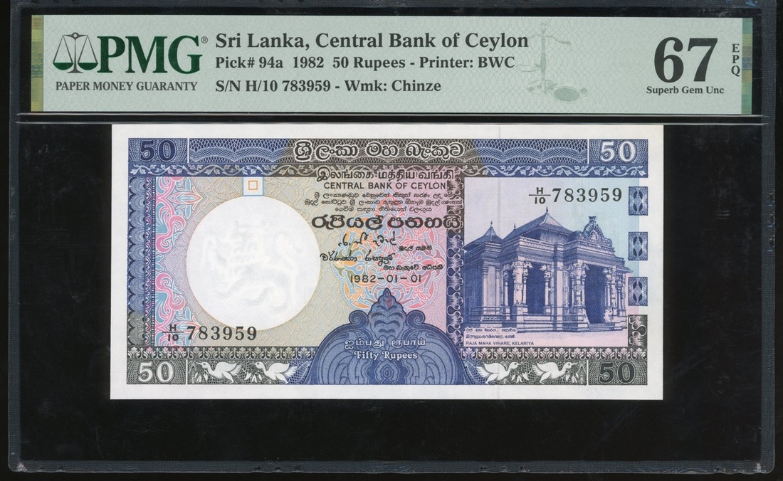 Sri Lanka, 50 Rupees, 1.1.1982, serial number H/10 783959, (Pick 94a), PMG 67EPQ Superb Gem Uncirculated
