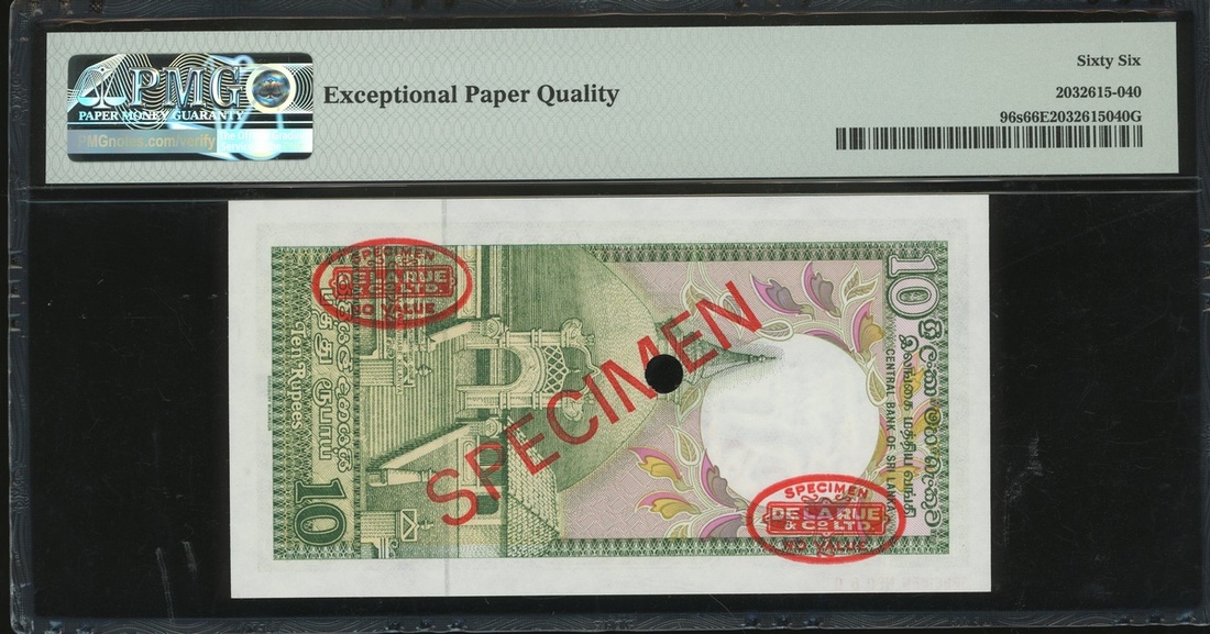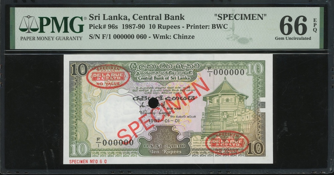 1987年斯里蘭卡中央銀行10盧比樣票,編號E/1 000000,PMG 66EPQ