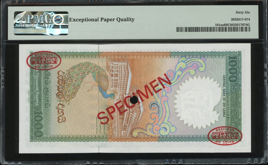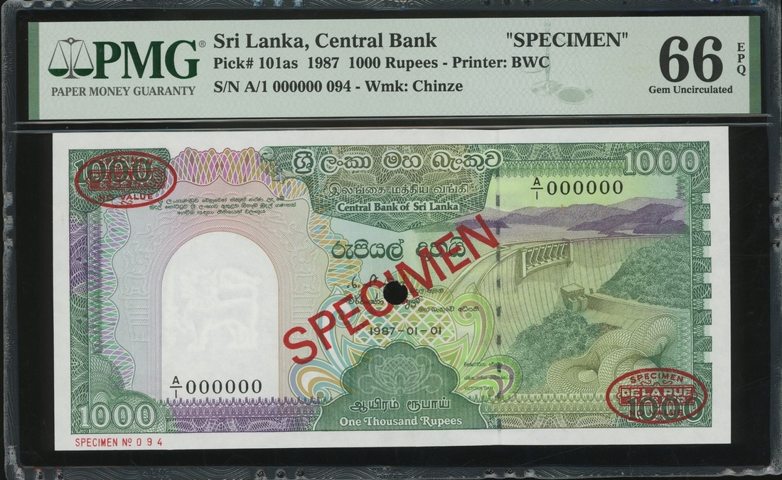 1987年斯里蘭卡中央銀行1000盧比樣票,編號A/1 000000,PMG 66EPQ
