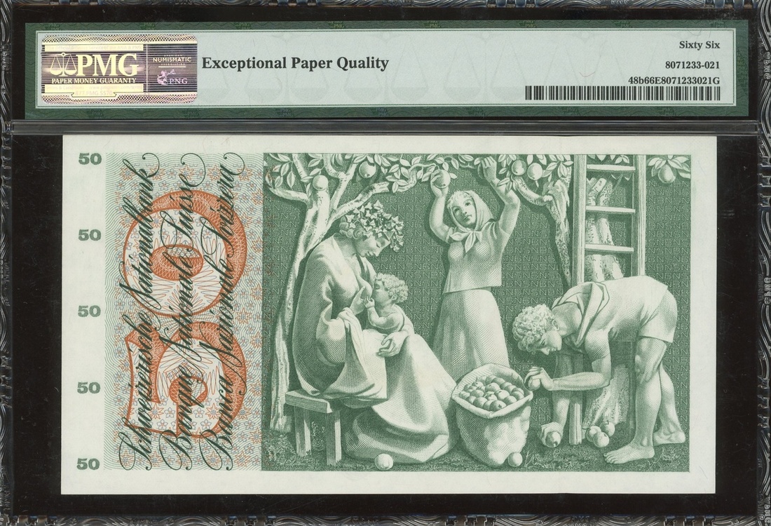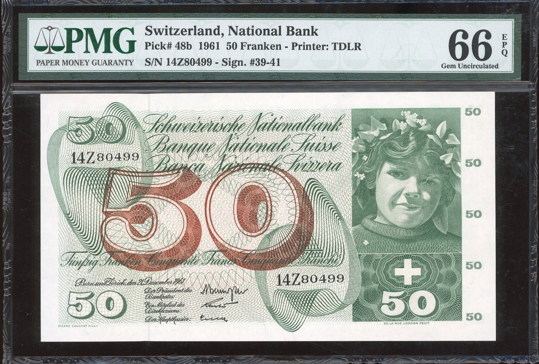 Switzerland, National Bank, 50 franken, 1961, serial number 14Z80499, (Pick 48b), PMG 66EPQ Gem Uncirculated .