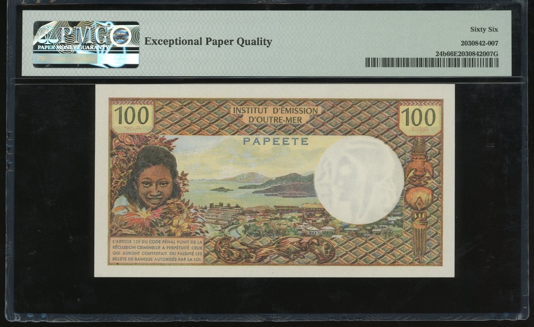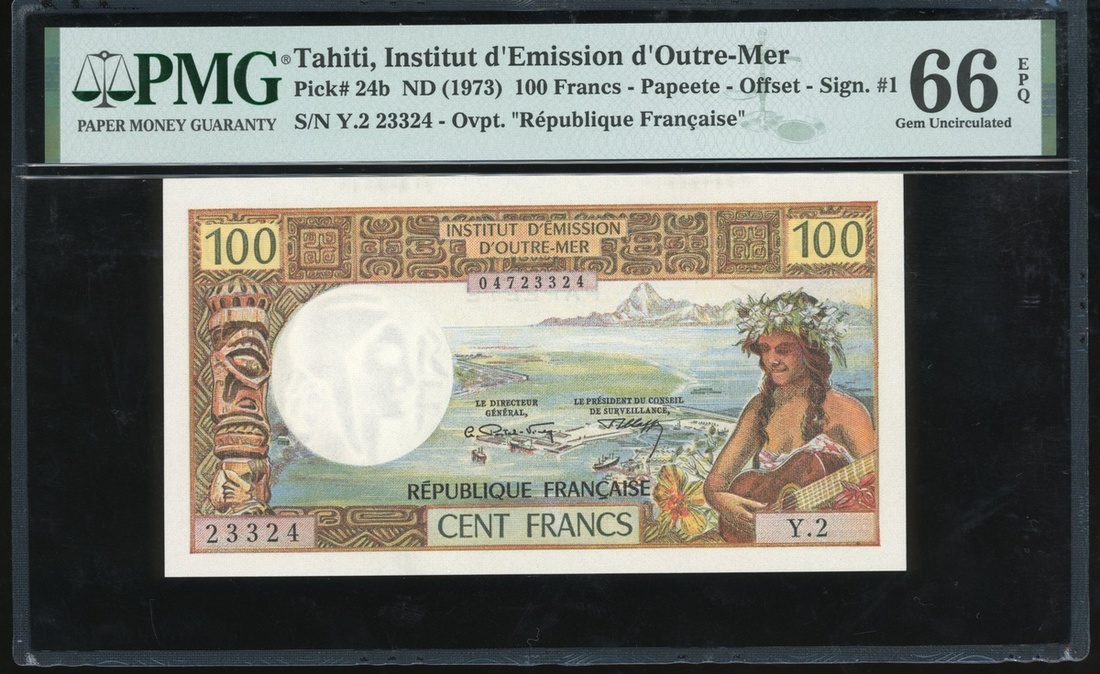 1973年大溪地100法郎,無日期,編號Y.2 23324,加蓋"Republique Francaise",PMG 66EPQ