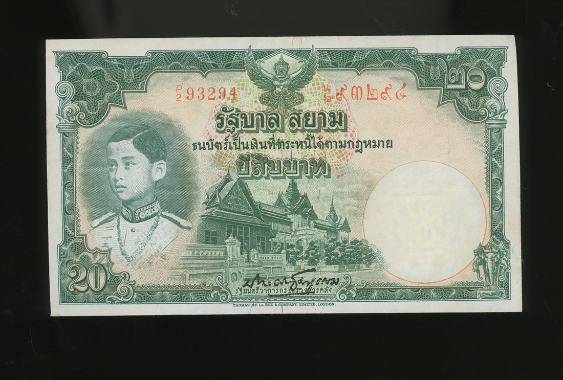 泰國一組3枚,包括1942-44年10銖庫存票,1953年10銖,及1936年20銖,編號W/402 440150 及 P2 93294,10銖分別評PMG 58,66EPQ,20銖曾壓,EF品相,紙邊有微黃