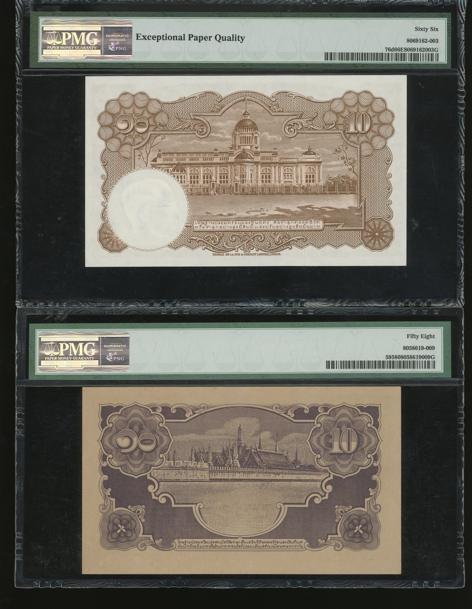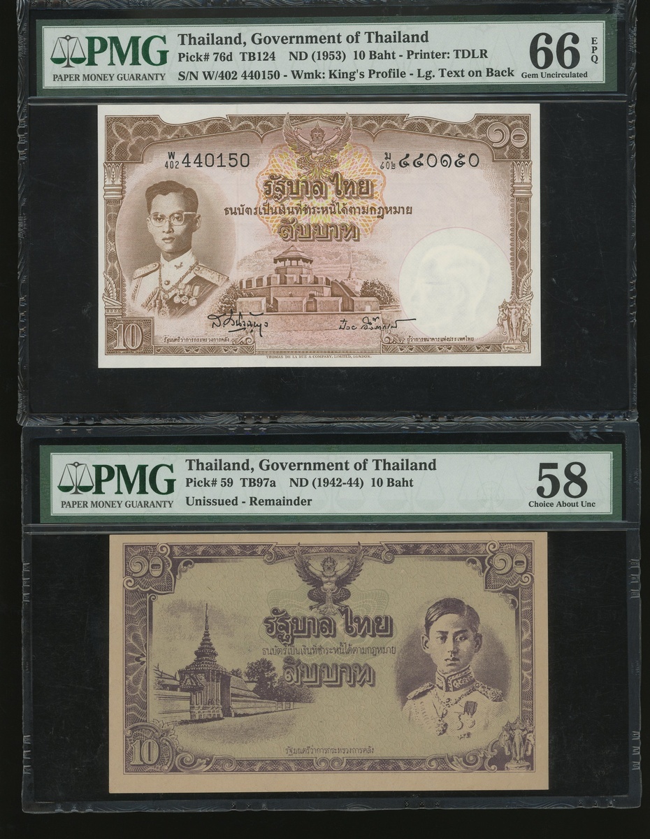 Government of Thailand, a group of 3x notes, consists of 10 baht, remainder, ND(1942-44), 10 baht, ND(1953), and 20 baht, ND(1936), serial numbers W/402 440150 and P2 93294, (Pick 59, 76d and 36), 10 bahts graded PMG 58 amnd 66EPQ respectively, 20 baht pressed extremely fine with mild foxing at edges (3) .