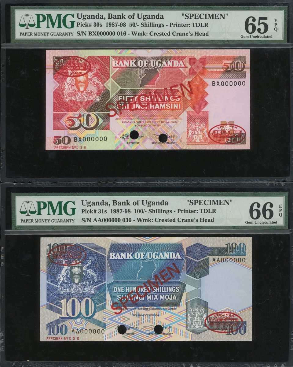 1987-98年烏干達50、100先令樣票各一枚,編號AA000000 030、BX000000 016,分別PMG 65EPQ及66EPQ