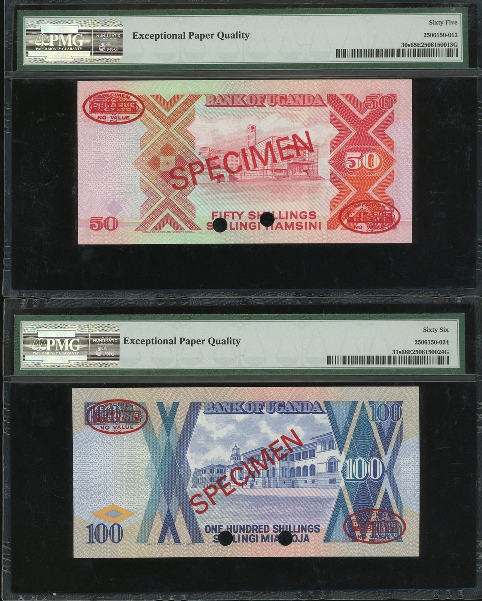 Bank of Uganda, a pair of speciments, 50 and 100 shillings, 1987-98, serial numbers AA000000 030 and BX000000 016, (Pick 30s and 31s), PMG 65EPQ and 66EPQ respectively (2) .