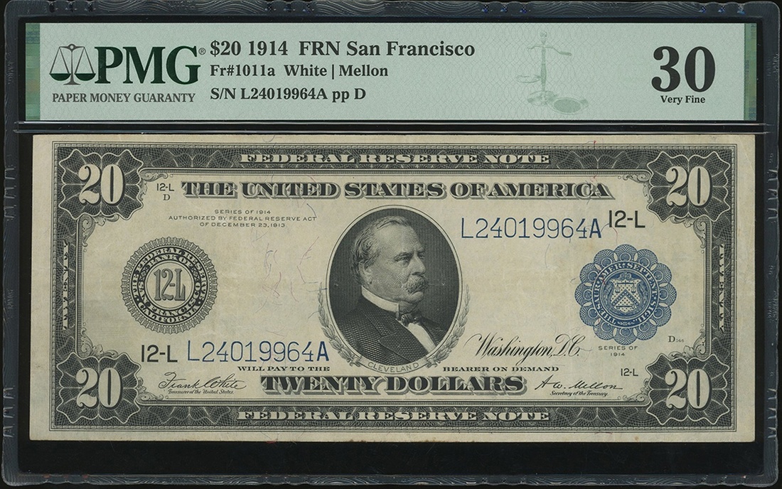1914年美國聯邦儲備券20元,編號 L24019964A,藍印,三藩市發行,PMG 30,輕微外附物
