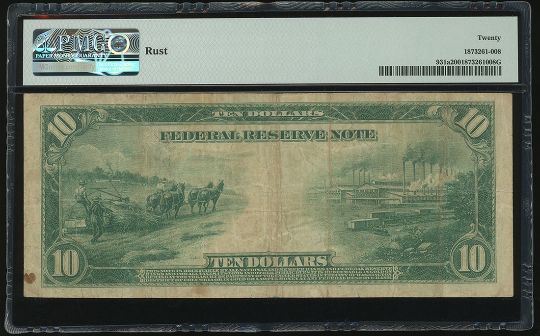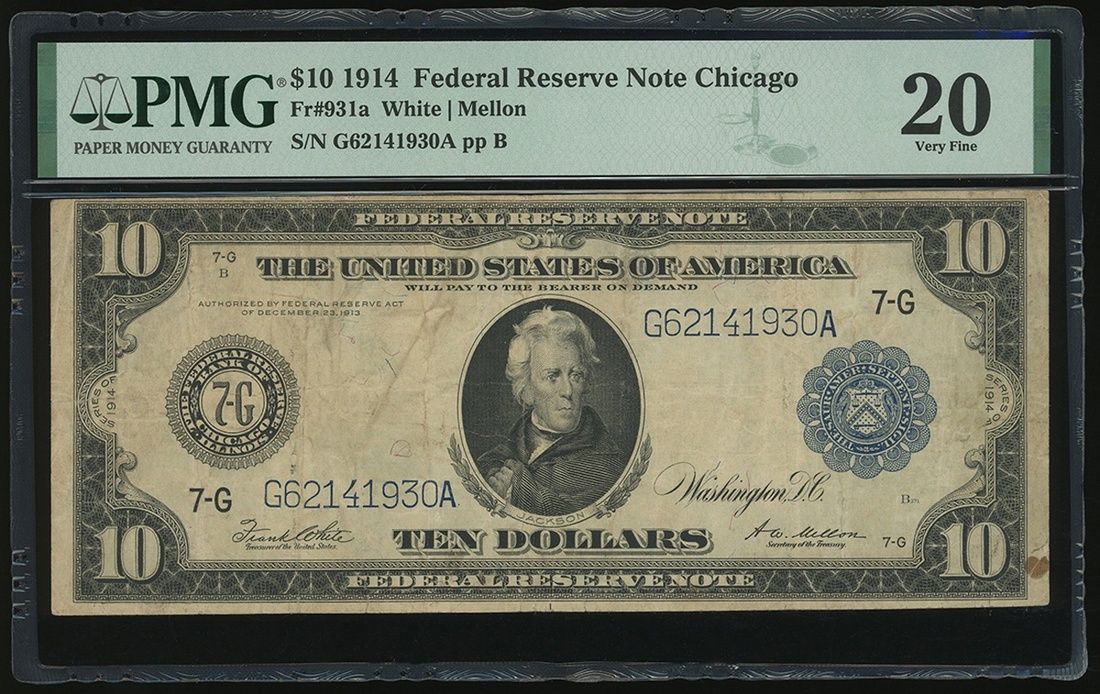 1914年美國聯邦儲備券10元,編號G62141930A,藍印,芝加哥發行,PMG 20,有鏽漬
