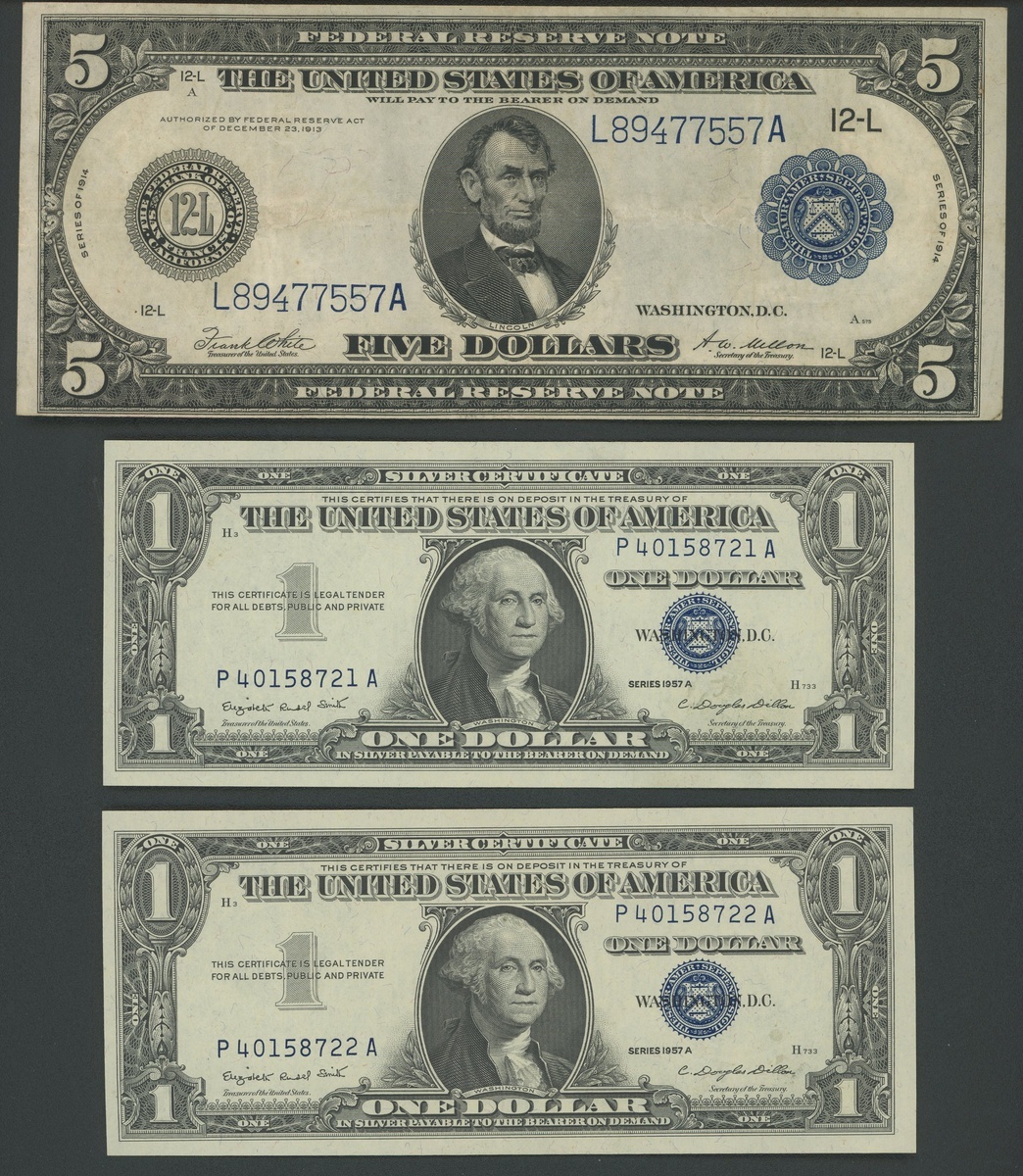 美國紙鈔一組3枚,包括1957A銀幣券1元連號一對,及1913年聯邦儲備券5元,編號P40158721A-22A及L89477557A,1元UNC,5元EF