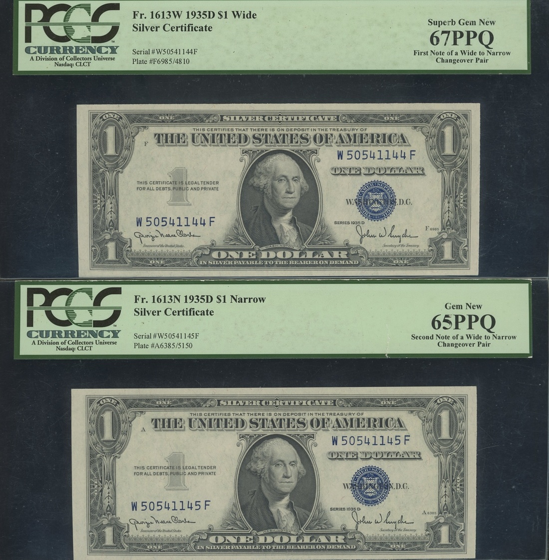 United States, Silver Certificate, a pair of $1, 1935D, a pair of Wide to Narrow Changeover notes, serial numbers W50541144F-145F, (Fr#1613W), the first graded PCGS Currency 67PPQ, the second 65PPQ, a spot on lower reverse right. (2)