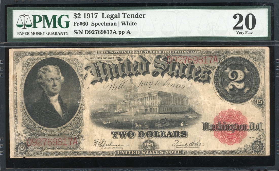 The United States of America, $2, Legal Tender, 1917, serial number D92769817A ppA, Jefferson at left, (Pick 60), PMG 20 Very Fine .