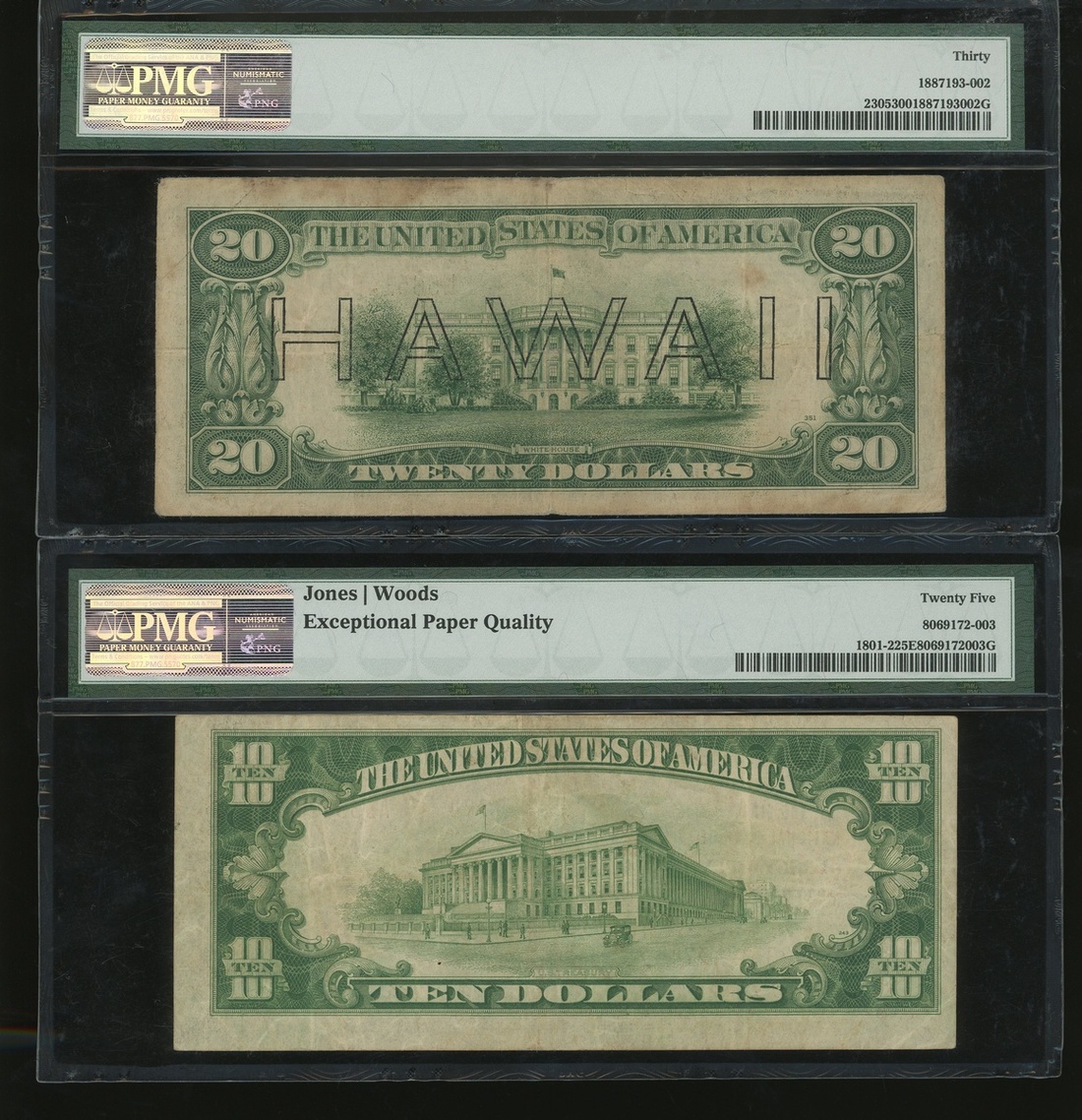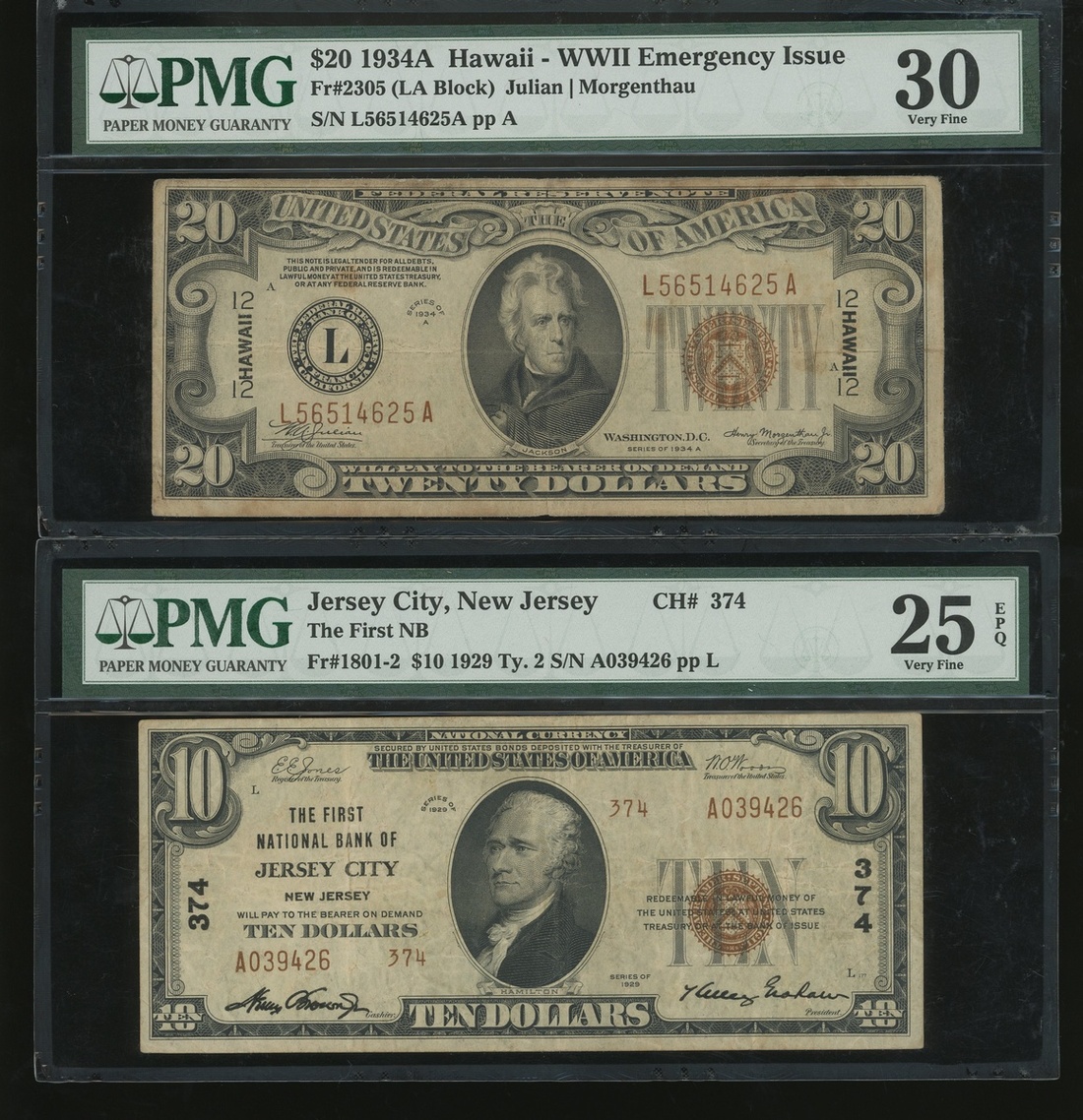 Hawaii - WWII Emergency Issue, $20, 1934A, also New Jersy $10, 1929, serial numbers L56514625A pp A and A039426 pp L, (Fr# 2305, CH#374), PMG 30 Very Fine (Jones Woods) .