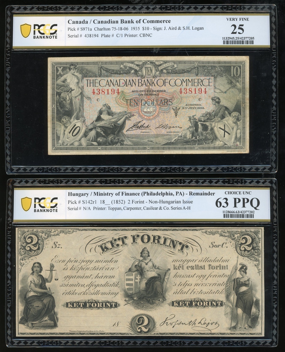 1896-1899年美國1元銀元券,1852年匈牙利財政部(賓夕法尼亞州費城)2福林庫存票,及1935年加拿大商業銀行10元,編號4122536,M62062099A,N/A 及 438194,分別評PCGS Banknote 15,10,63PPQ 及 25