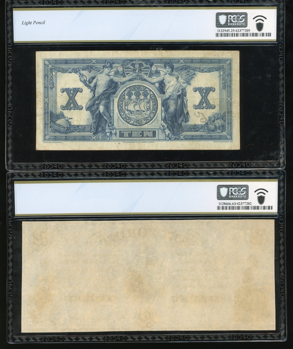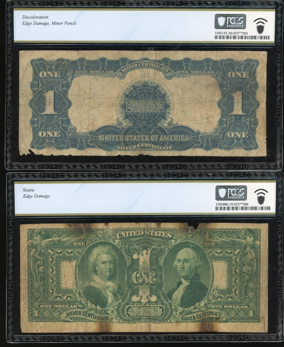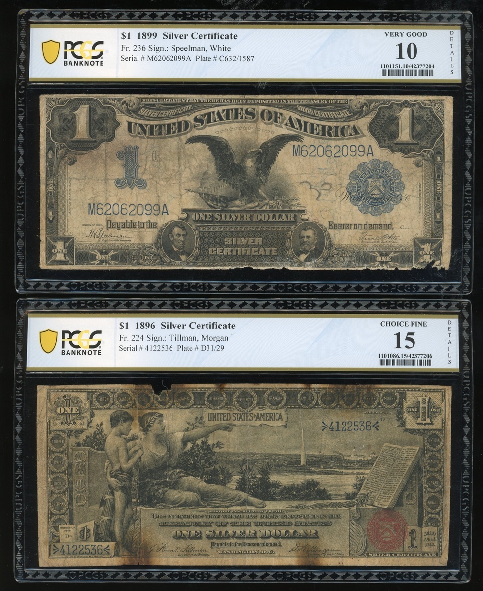 United States, a pair of $1, silver certificate, 1896 and 1899, and Hungary Ministry of Finance (Philadelphia, PA), 2 forint remainder, 1852 and Canadian Bank of Commerce, $10, 1935, serial numbers 4122536, M62062099A, N/A abd 438194, (Pick 224, 236, S142r1 and S971a), graded PCGS Banknote 15, 10, 63PPQ and 25 respectively (4).