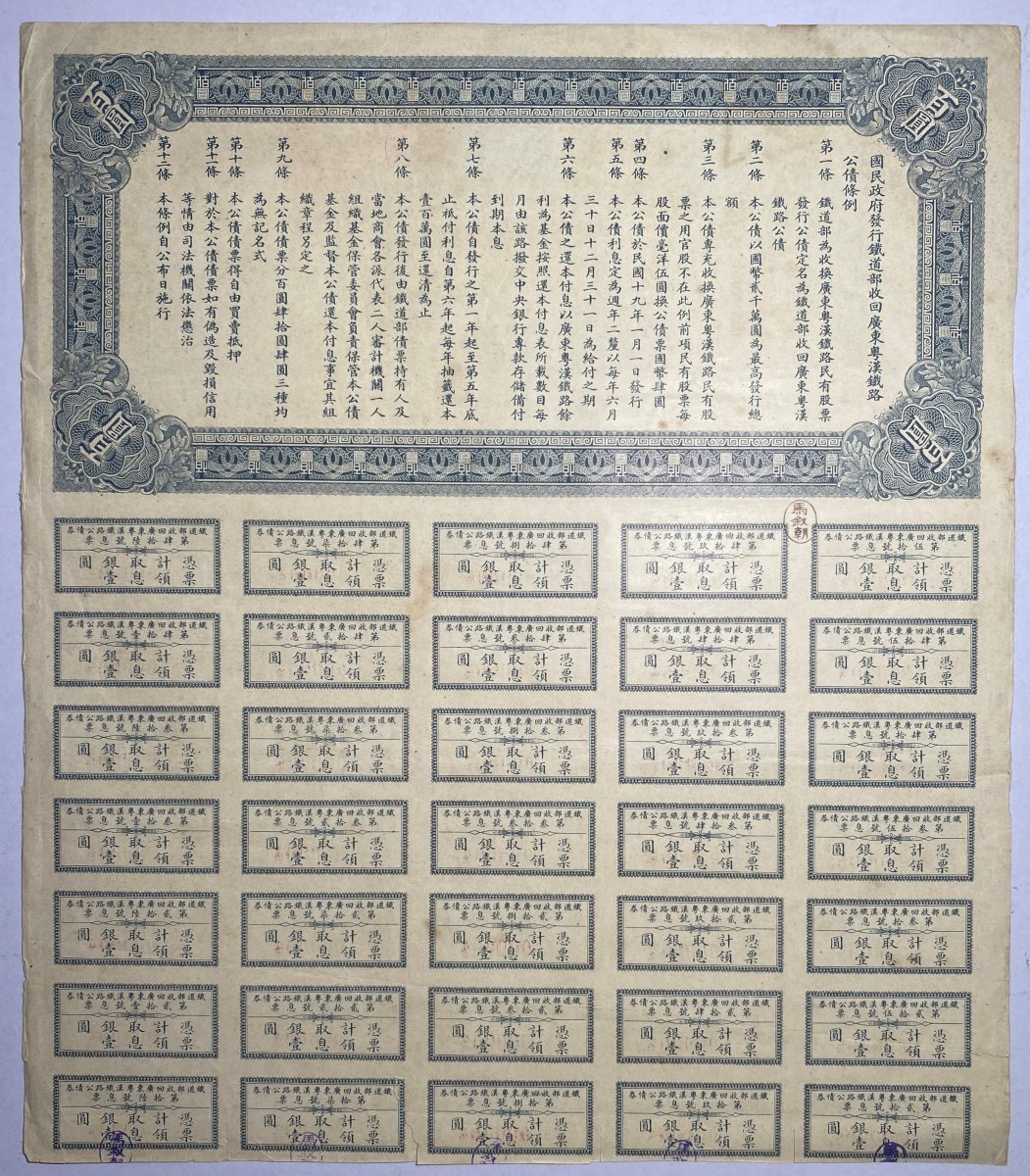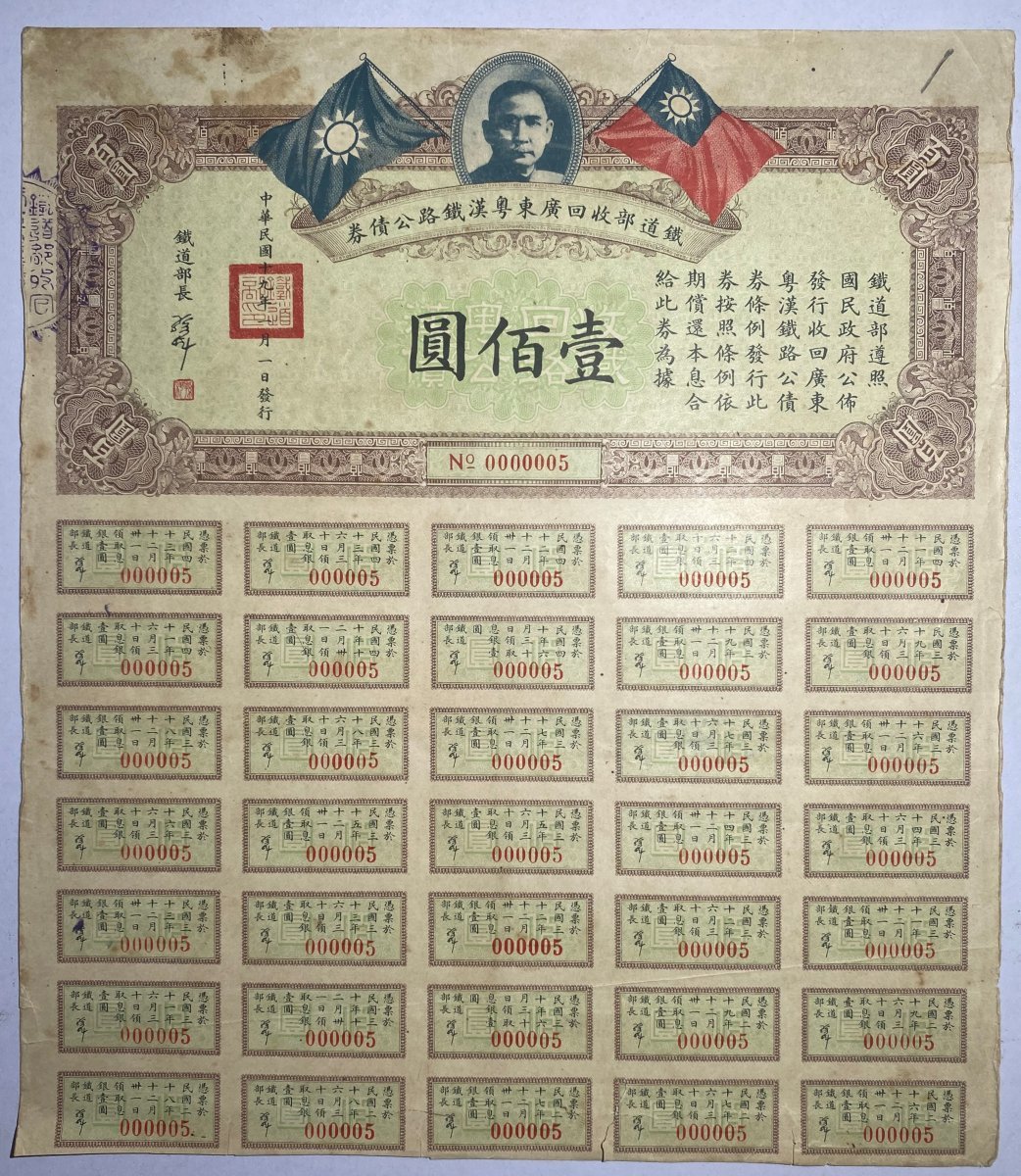 民國十九年粵漢鐵路壹百圓債券,罕見細編號0000005,AVF
