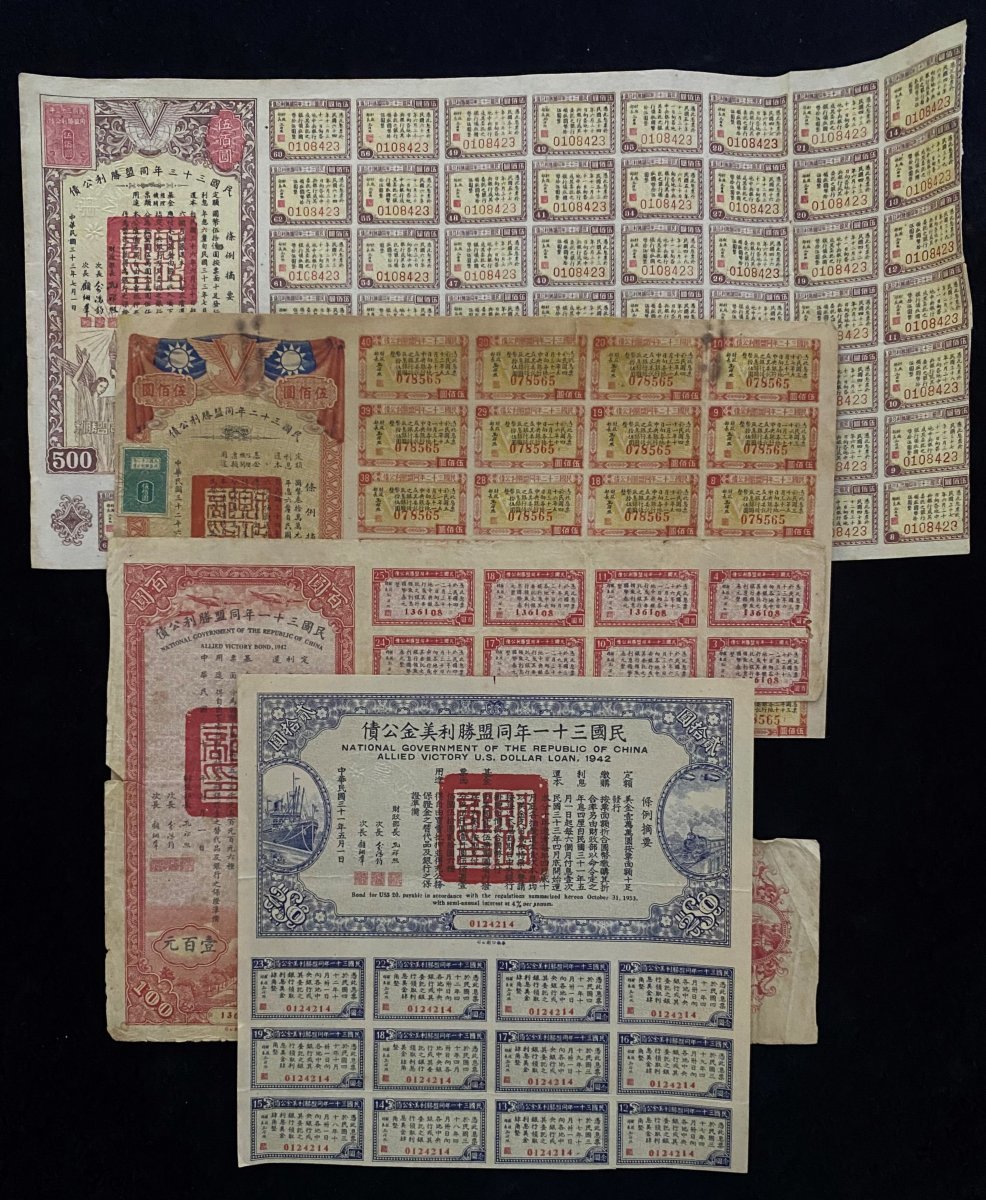 National Government of the Republic of China Allied Victory US Dollar Loan, group of 4, 1942: USD$20 #0124214, 100 yuan 136108,