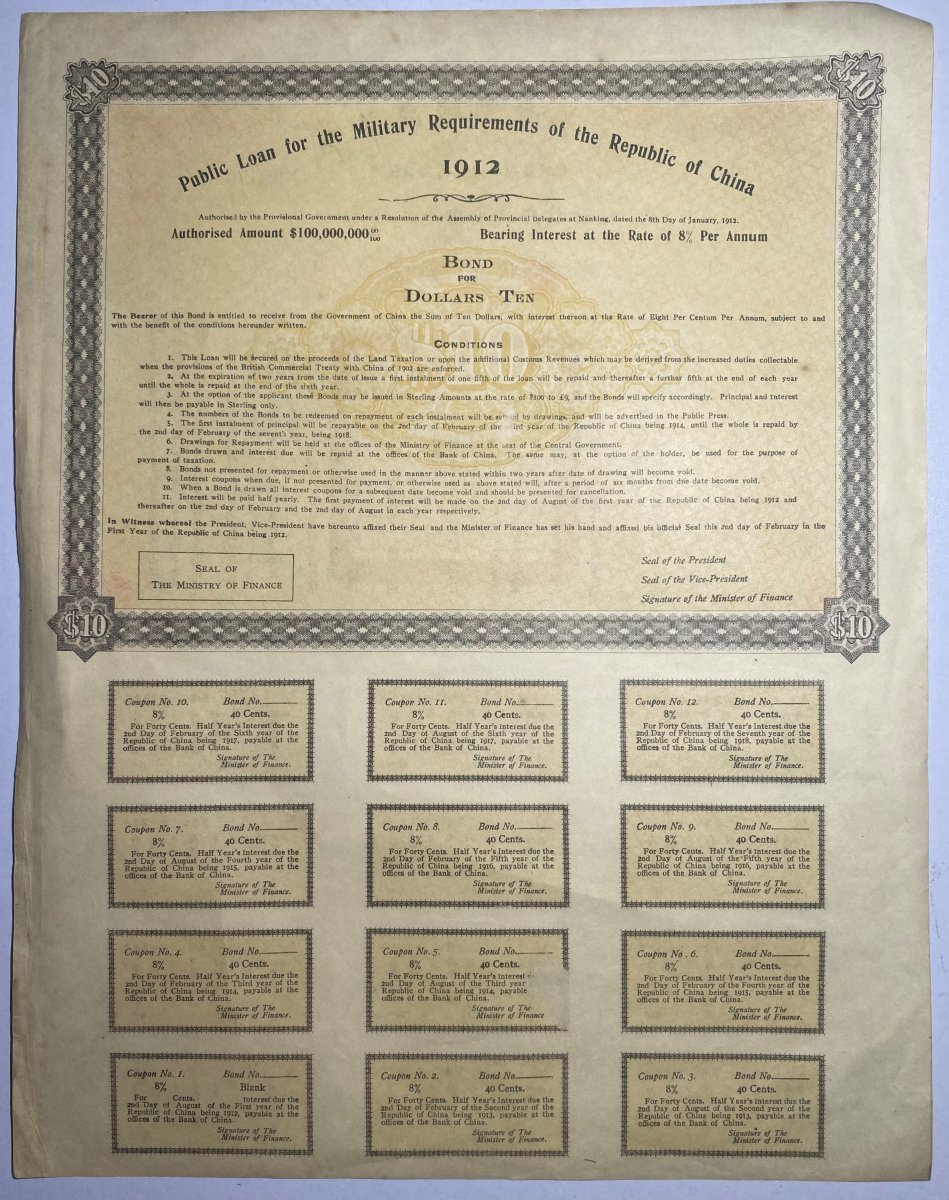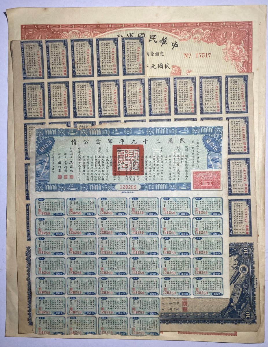 Republic of China, group of 3 Army Supply Bonds, 10 yuan, 1912, #17517, 10 yuan, 1941, #665453 and 50 yuan, 1942, #128259,