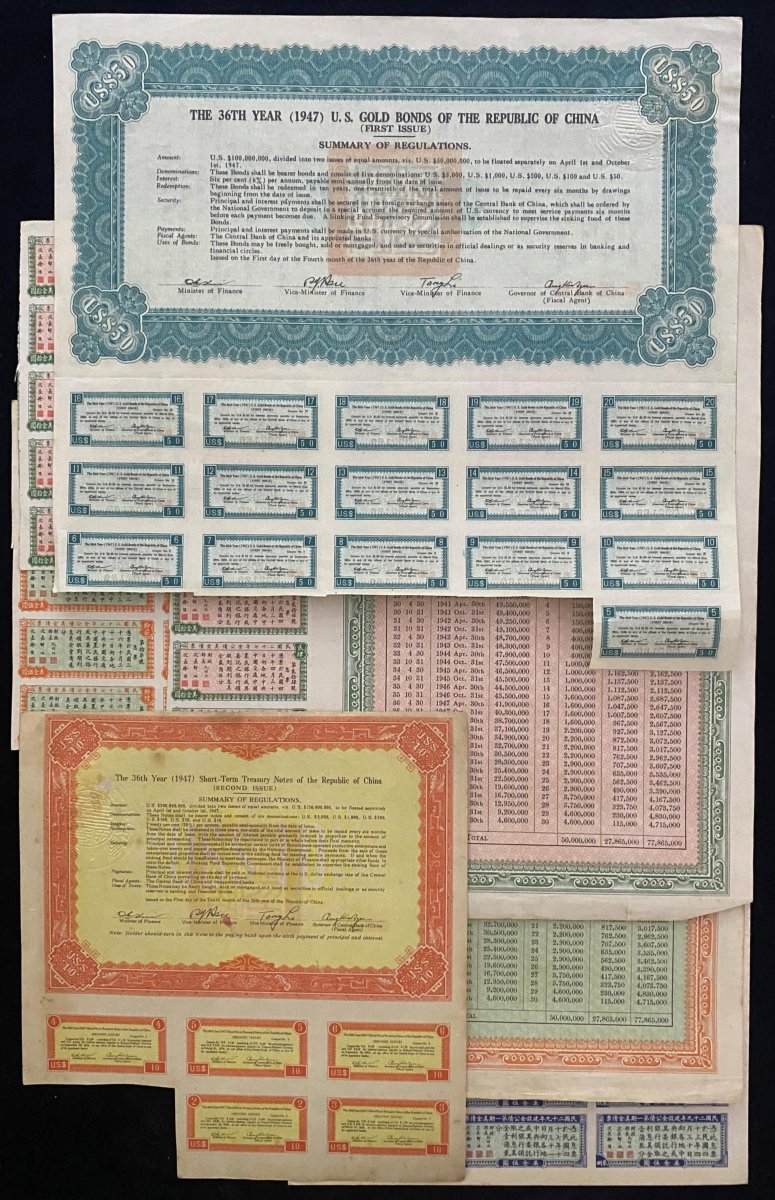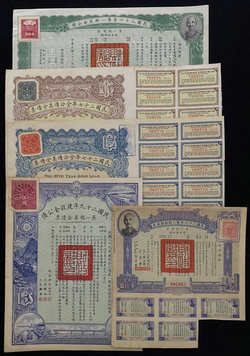 Republic of China, group of 5 bonds in USD denominations, 1940 Construction Loan, $5 #078704, 1938 Gold Loan of the Republic of China, $5 #066715 and $10 #798876, 1947 US Gold Bonds of the Republic of China (First Issue), $50 #002169 and 1947 Short Term Treasury Notes of the Republic of China, $10 #007062,